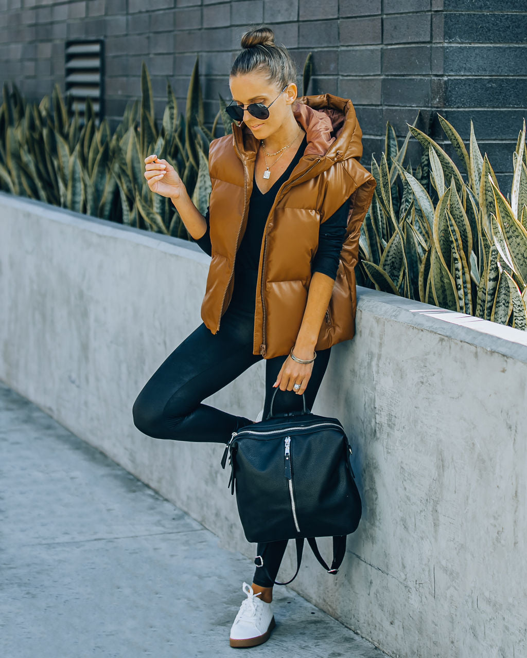 Pick a puffer for an instantly cool look! Our Adler Pocketed Hooded Faux Leather Puffer Vest comes in a classic camel hue. Crafted with side pockets and a hood. Secured with a front zipper closure. Styled with the Lenox Black Frame Grey Gradient Aviator Sunglasses. Initial Card Necklace. Chloe Mini Necklace. Simple Bangle Bracelet. Kenzie Backpack. Avery Knit Pullover. Spanx Faux Leather Legging. and Brielle Woven Faux Leather Sneaker.