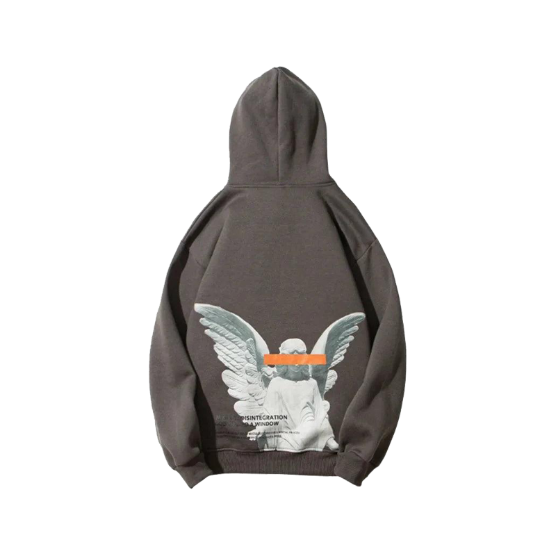 Angel God Print Fleece Hoodie. Cotton-polyester blend. standard thickness. and a hooded collar for cozy comfort.