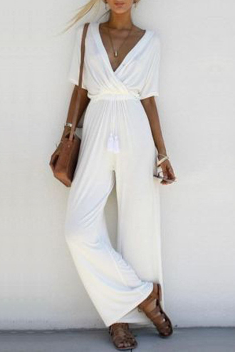Casual jumpsuit with a V-neck design is comfortable to wear. The cinched waist accentuates the figure. Wear it for any occasion~