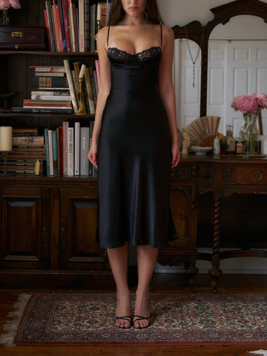This silk midi dress features fully lined underwire cups trimmed with lace. The back has an elastic bra band.