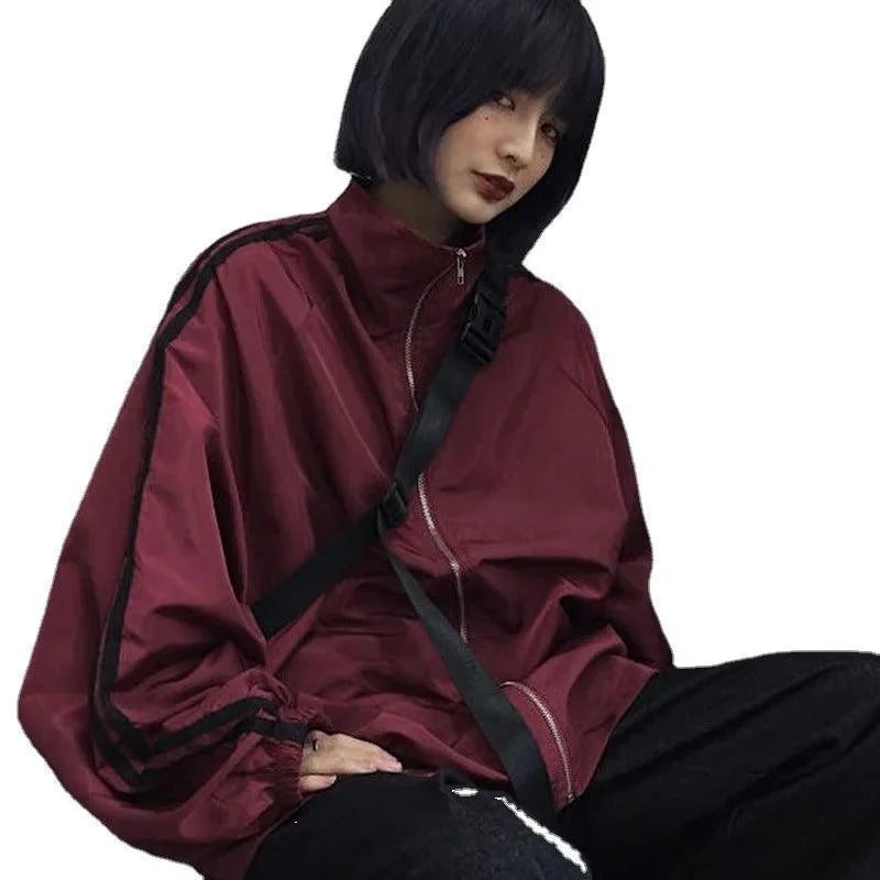 BF Style Windbreaker Oversized Jacket. Crafted from polyester. this vintage-inspired piece features a stand collar and loose fit.