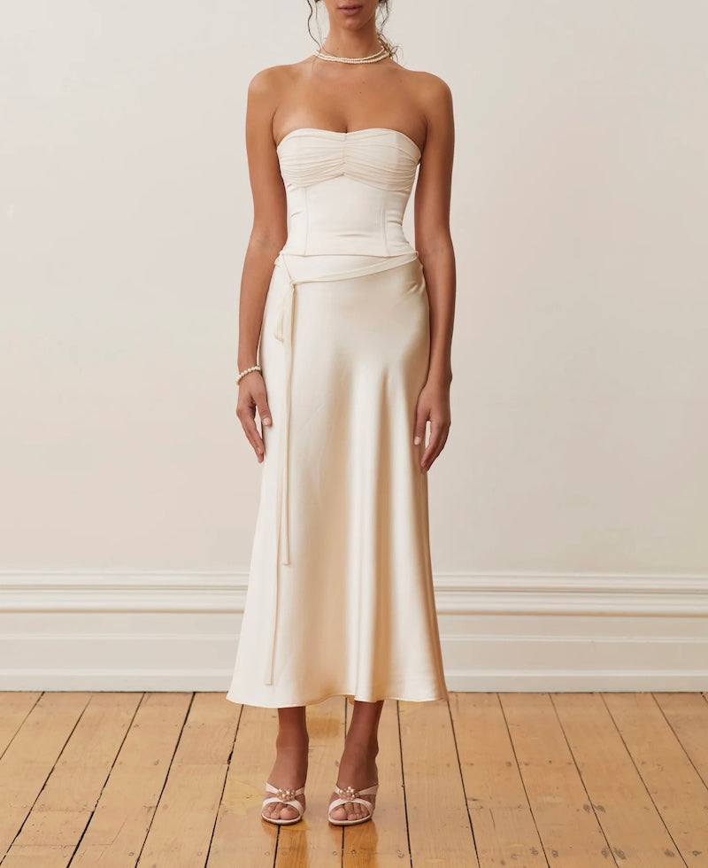 The perfect harmony of sensual lustrous silky satin in vintage beige with hand-tacked ruching