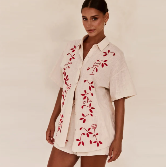A fashionable ensemble crafted from embroidered linen fabric for a touch of bohemian charm. This coordinated set includes a top and matching bottoms. perfect for adding a trendy and stylish flair to your summer wardrobe.