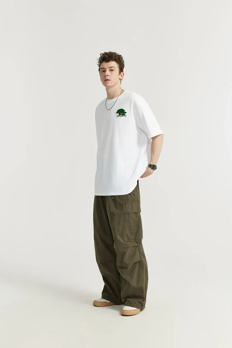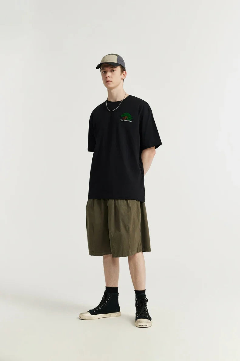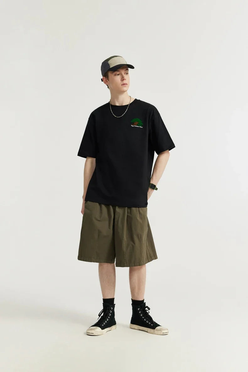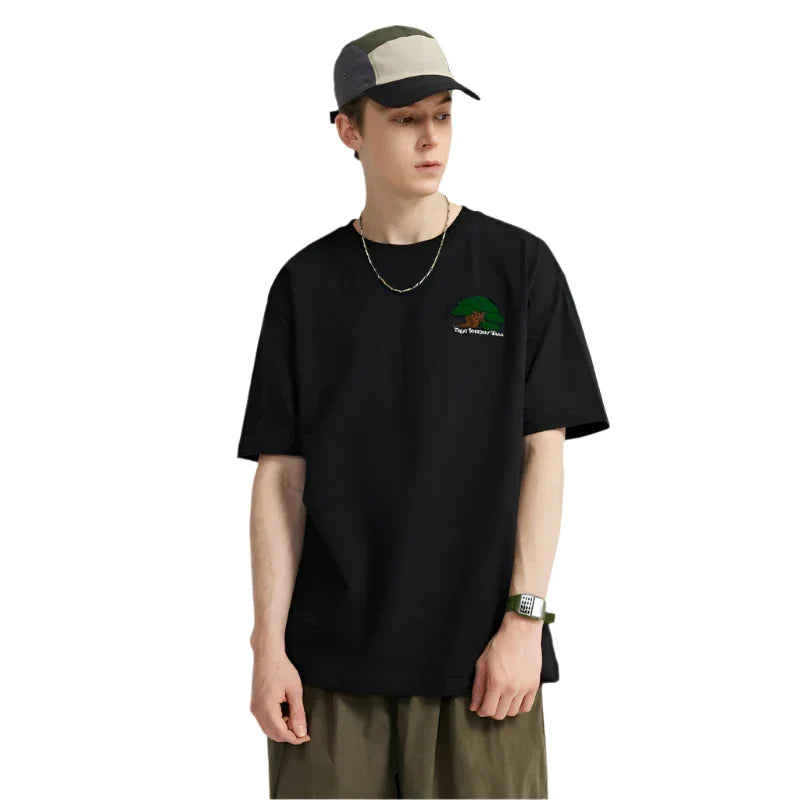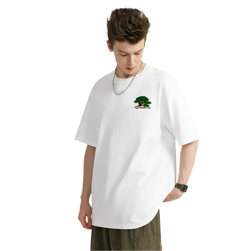 The Bonsai Thread Round Neck T-Shirt features an intricate bonsai embroidery. combining minimalistic design with nature-inspired detail for a subtle yet stylish look.