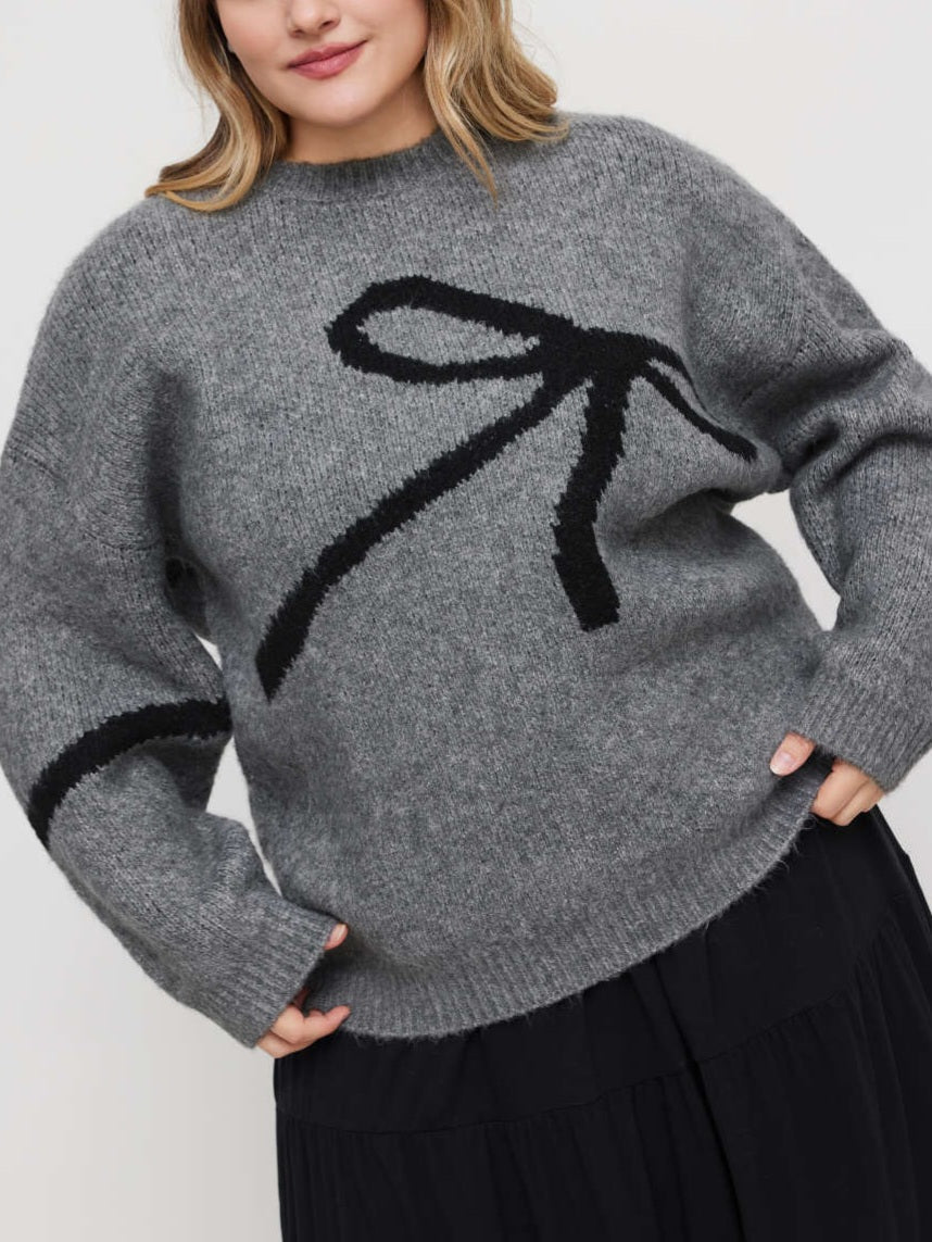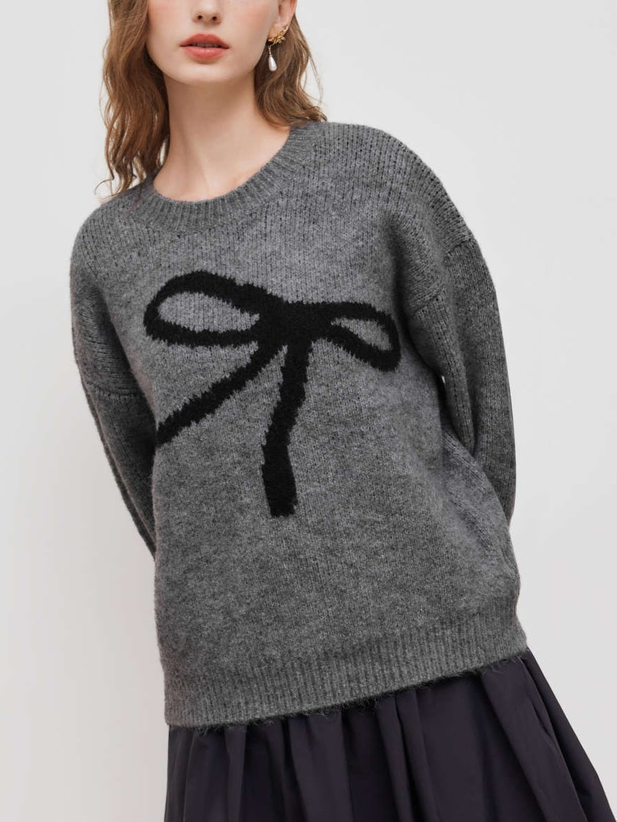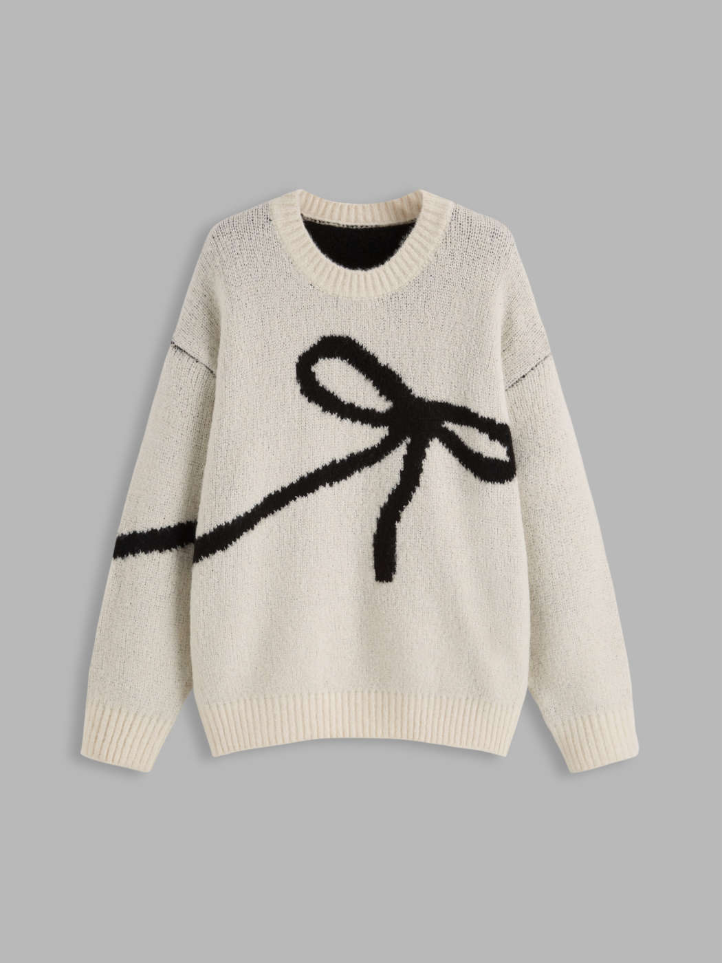 This cozy and stylish sweater is crafted from soft knit material. It is adorned with a striking black bow design that adds a touch of elegance and playfulness to the overall look.