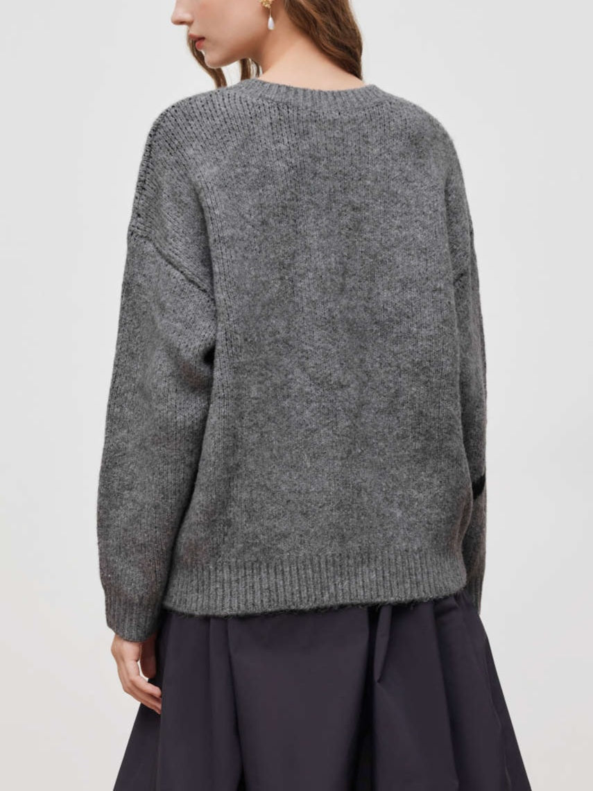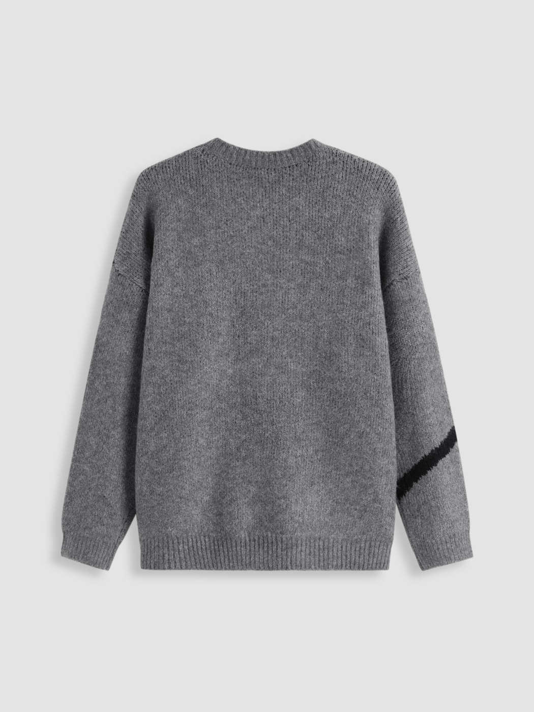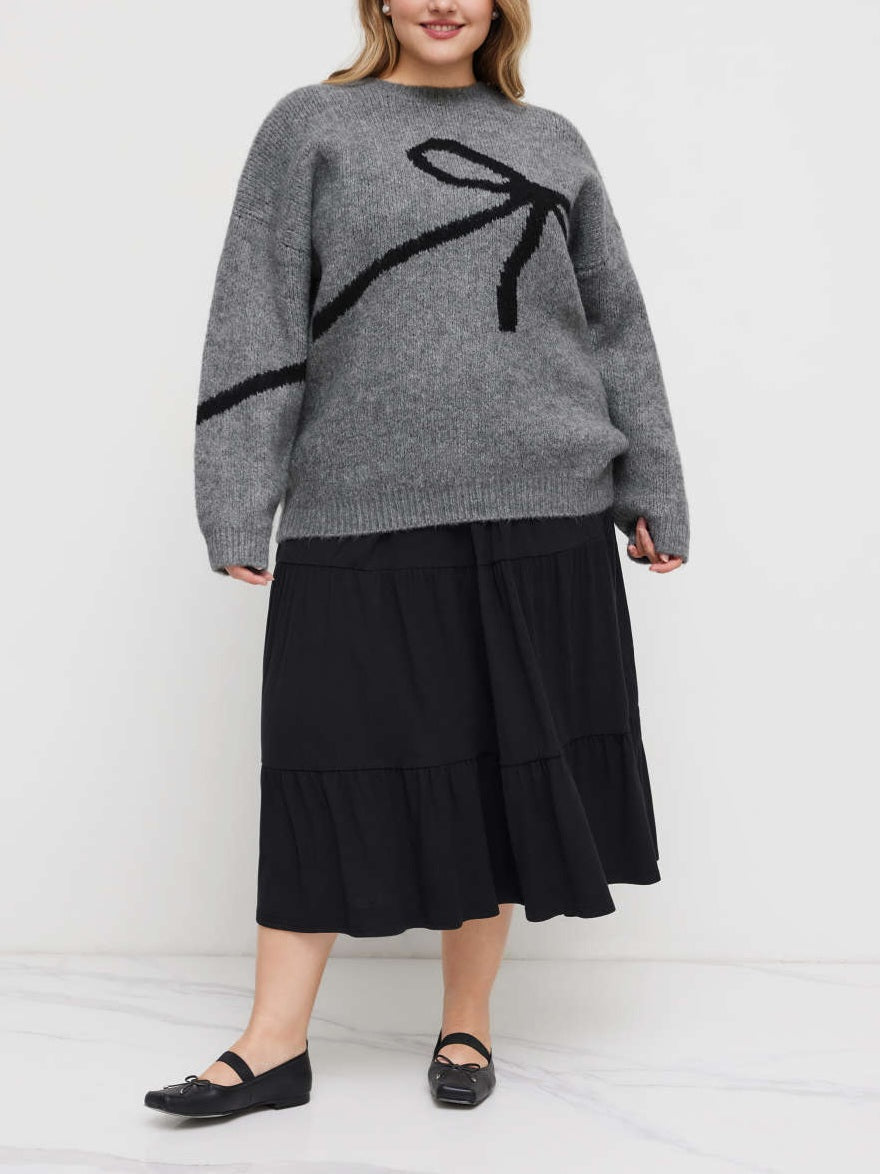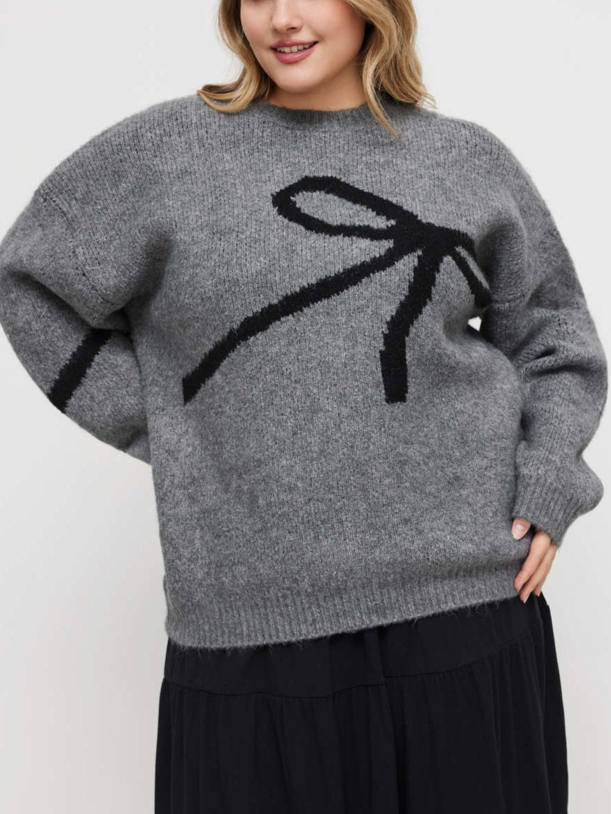 This cozy and stylish sweater is crafted from soft knit material. It is adorned with a striking black bow design that adds a touch of elegance and playfulness to the overall look.