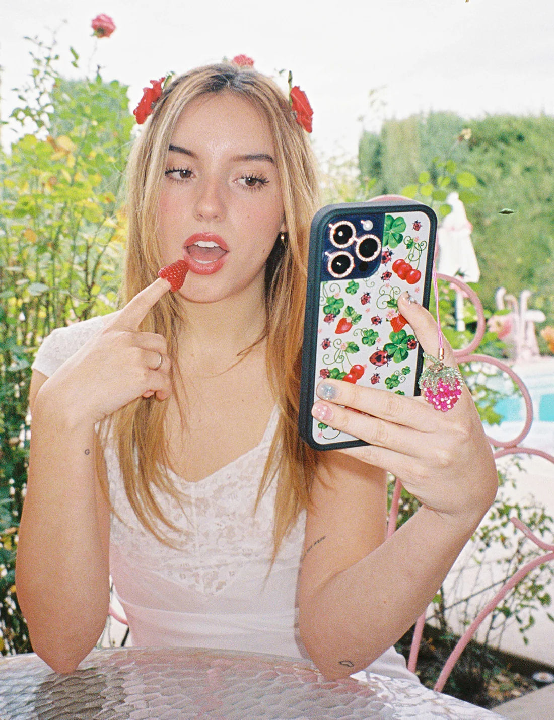 This iPhone case features irresistible cherries and strawberries with spiral stems throughout with little ladybugs across this adorable case.