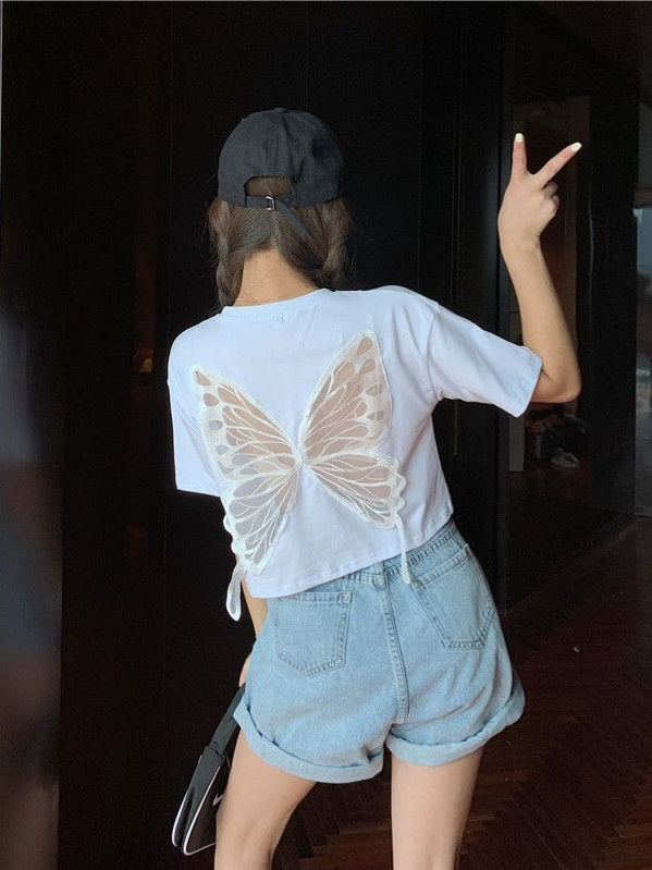 This edgy and stylish crop top features a unique butterfly wing cutout design on the back.