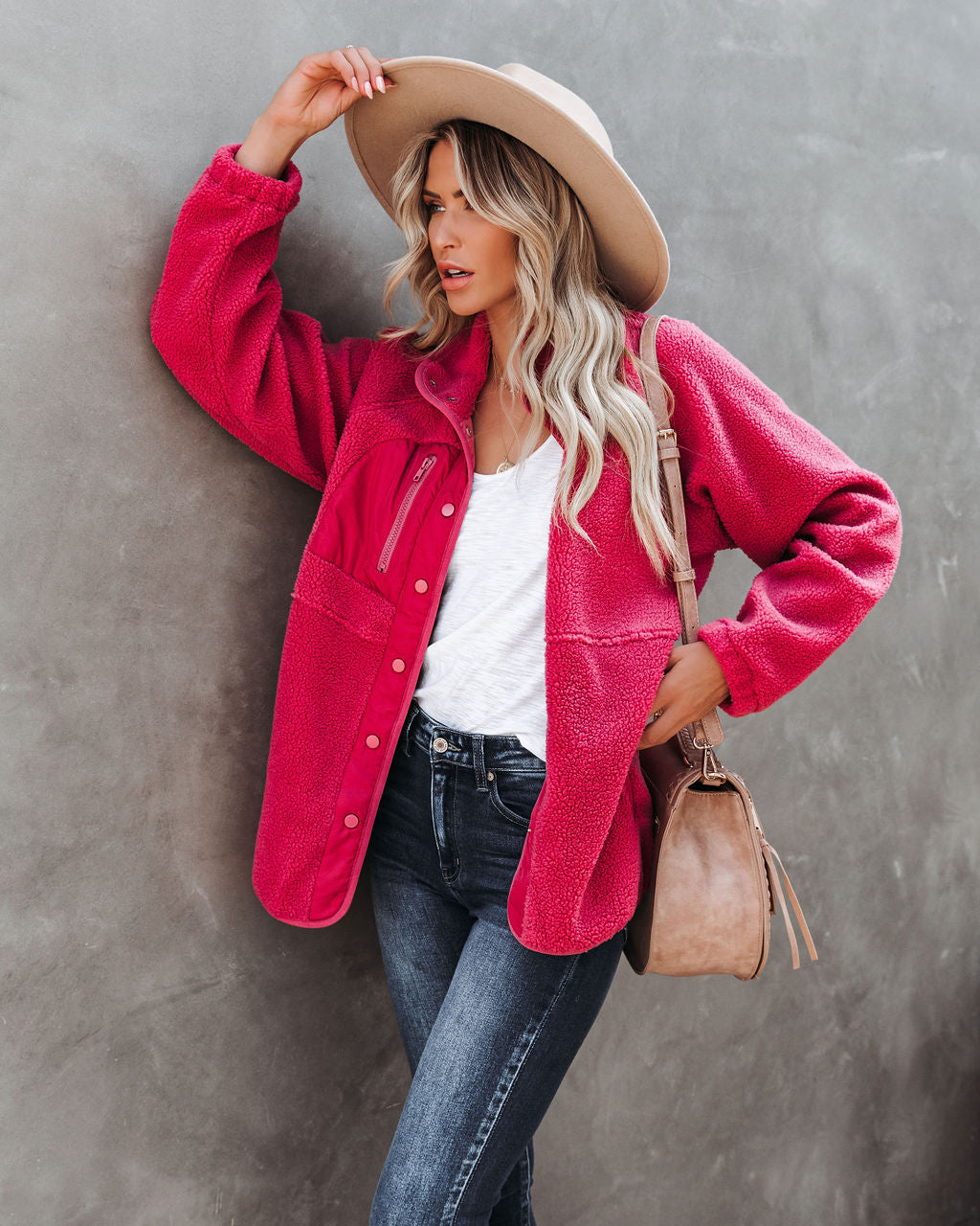 Our Cabin Pocketed Fleece Jacket will keep you cozy at any occasion! This mulberry fleece button down jacket is crafted with front zipper pockets. Finished with bust and side pockets. Styled with the El Dorado Hat. Perfect Hoop Earrings. Chloe Mini Necklace. The Buddha Wheel Necklace. Simple Bangle Bracelet. Physique Racerback Tank. Highland Bag. Jenna High Rise Skinny. and Kinsley Faux Leather Lace Up Boot.