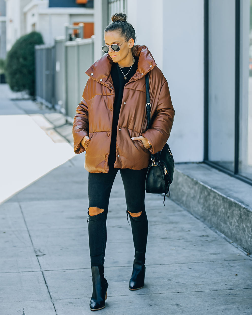 Always be warm and stylish in our Cade Pocketed Faux Leather Puffer Jacket! This brown faux leather jacket is detailed with front snap button closures and side pockets. Water resistant. Styled with the Chloe Mini Necklace. Compass Coin Necklace. Simple Bangle Bracelet. Highland Bag. Campfire Knit Sweater. Volt High Rise Distressed Skinny. and Jocelyn Heeled Bootie.