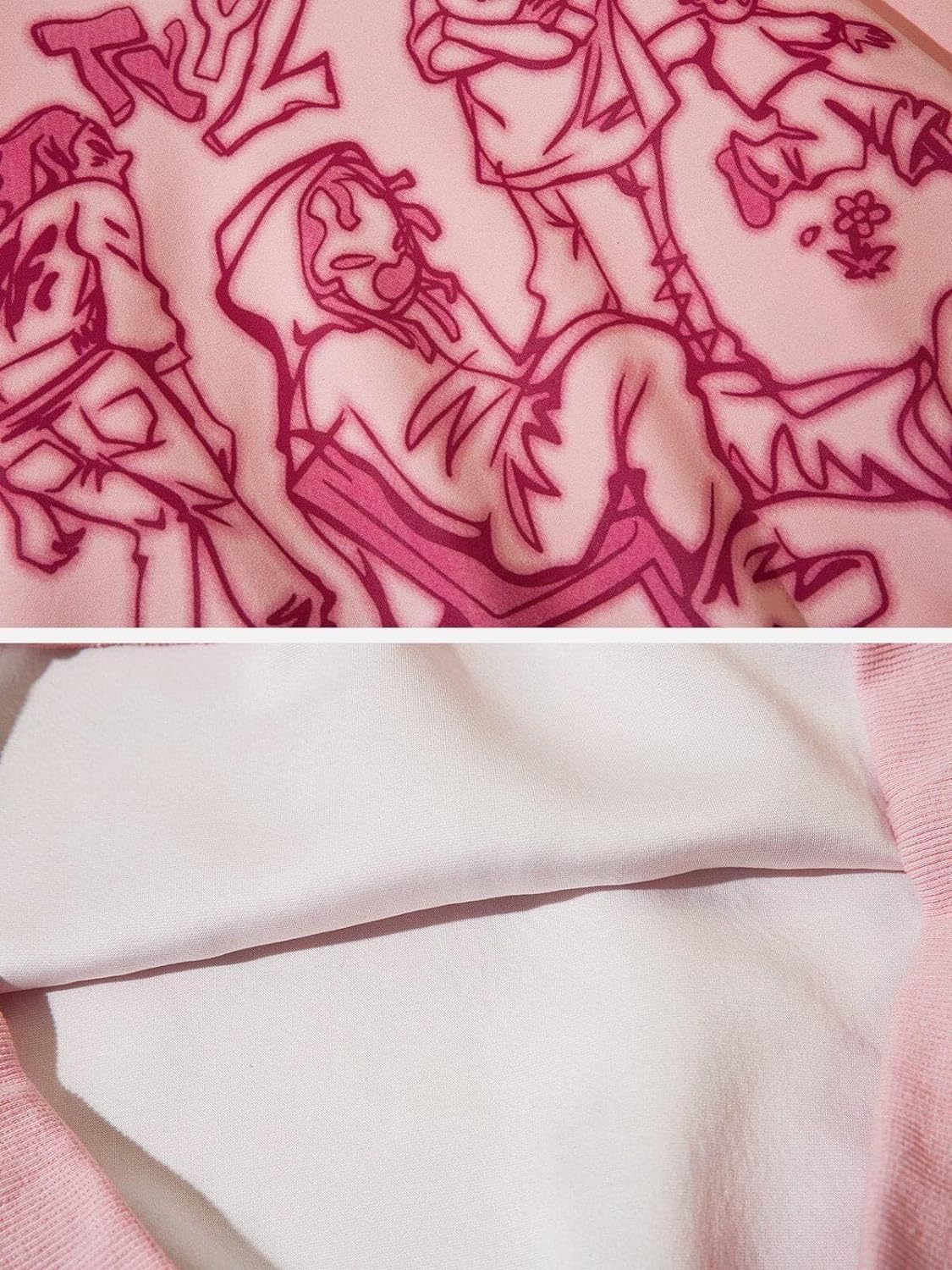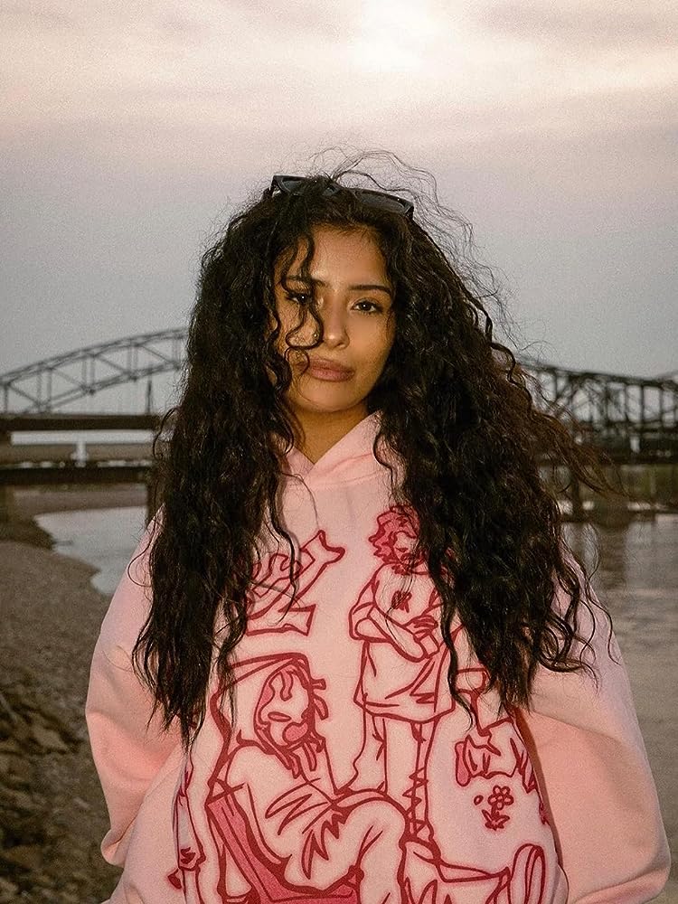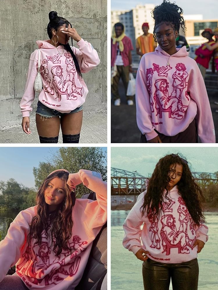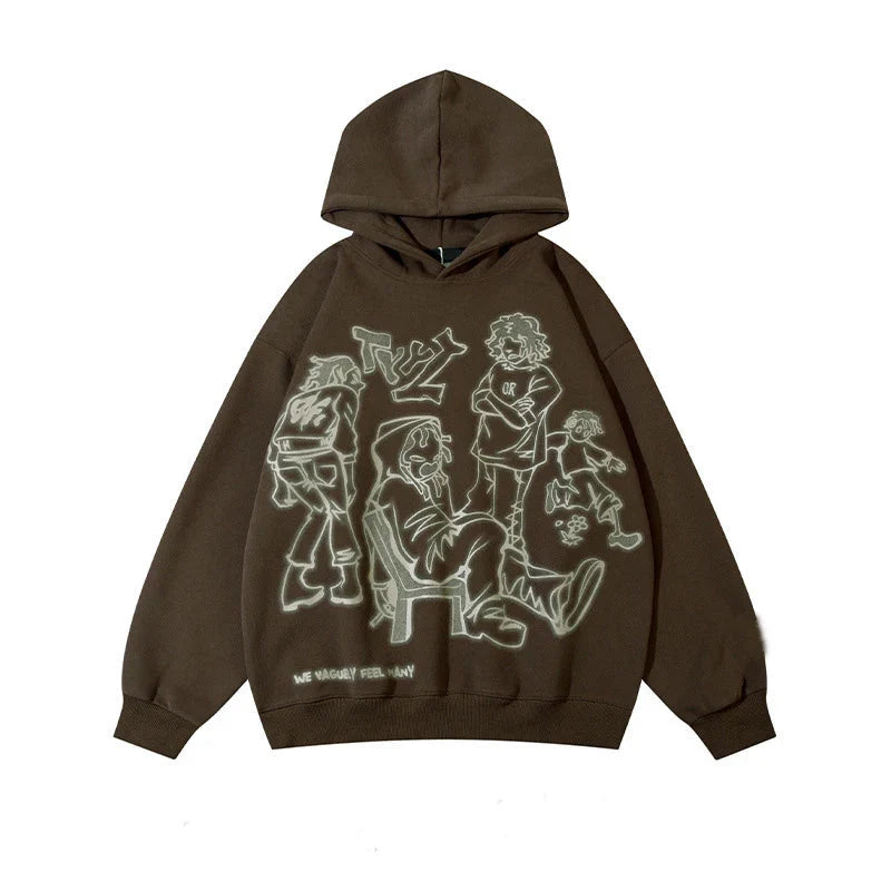 The "We Vaguely Feel Many" Hoodie has a unique and eye-catching design that combines colorful letters. geometric shapes. and abstract patterns.