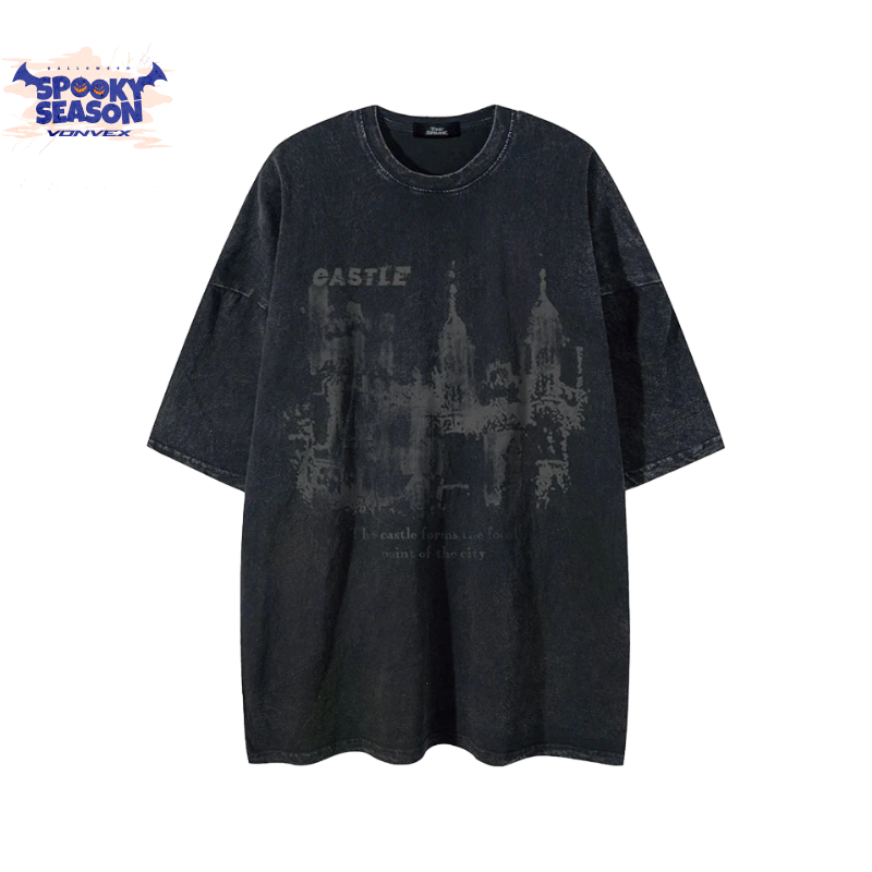 The Castle Noir Graphic T-Shirt features a dark and mysterious castle design. perfect for those who love gothic-inspired streetwear. Its soft fabric and bold graphic make it a standout piece for any casual look.