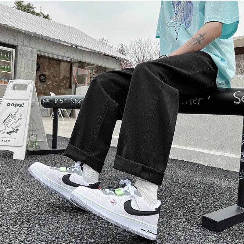 Feature details include a Button Fly closure. pocket decorations. a Solid pattern. a Loose fit. a Full Length. straight jeans style. Midweight thickness. mid-waist type. and Denim material.