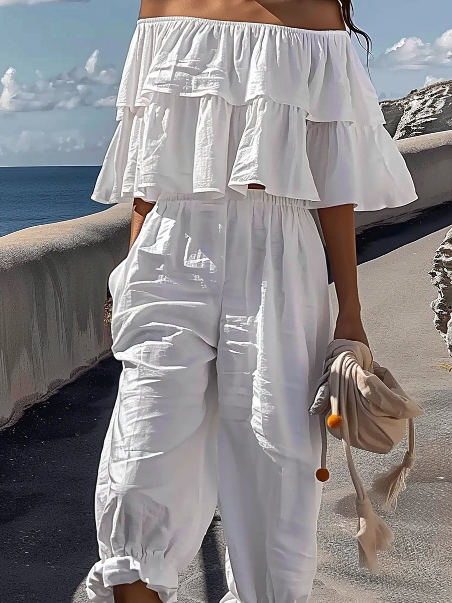 This cotton-linen ensemble features an off-shoulder design that adds a touch of sophistication. The chest is adorned with cascading ruffles resembling lotus leaves. creating a beautifully layered effect. The pants are designed with an elastic waistband for a comfortable fit. while the gathered hem at the bottom adds a relaxed and stylish finish. The loose fit ensures ease of movement. making it a perfect choice for casual outings or relaxed gatherings.