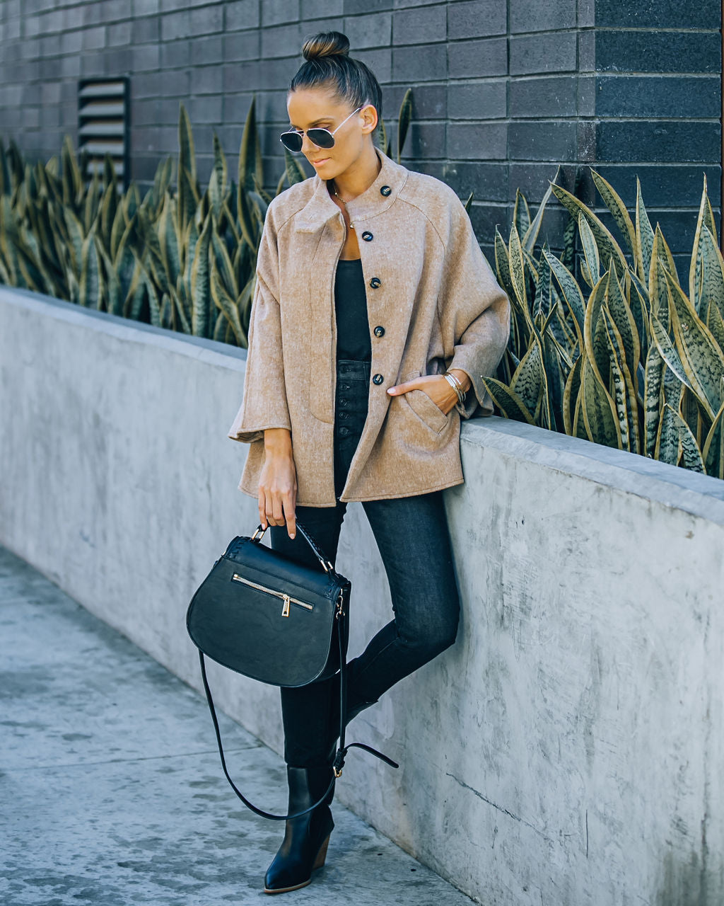 Say hello to your new commuting coat! Our Caylee Pocketed Coat was made in a classic camel hue. Secured with front button closures. Finished with side pockets. Styled with the Chloe Mini Necklace. Initial Card Necklace. Simple Bangle Bracelet. Highland Bag. Physique Racerback Tank. Keen High Rise Button Front Skinny. and Jocelyn Heeled Bootie.
