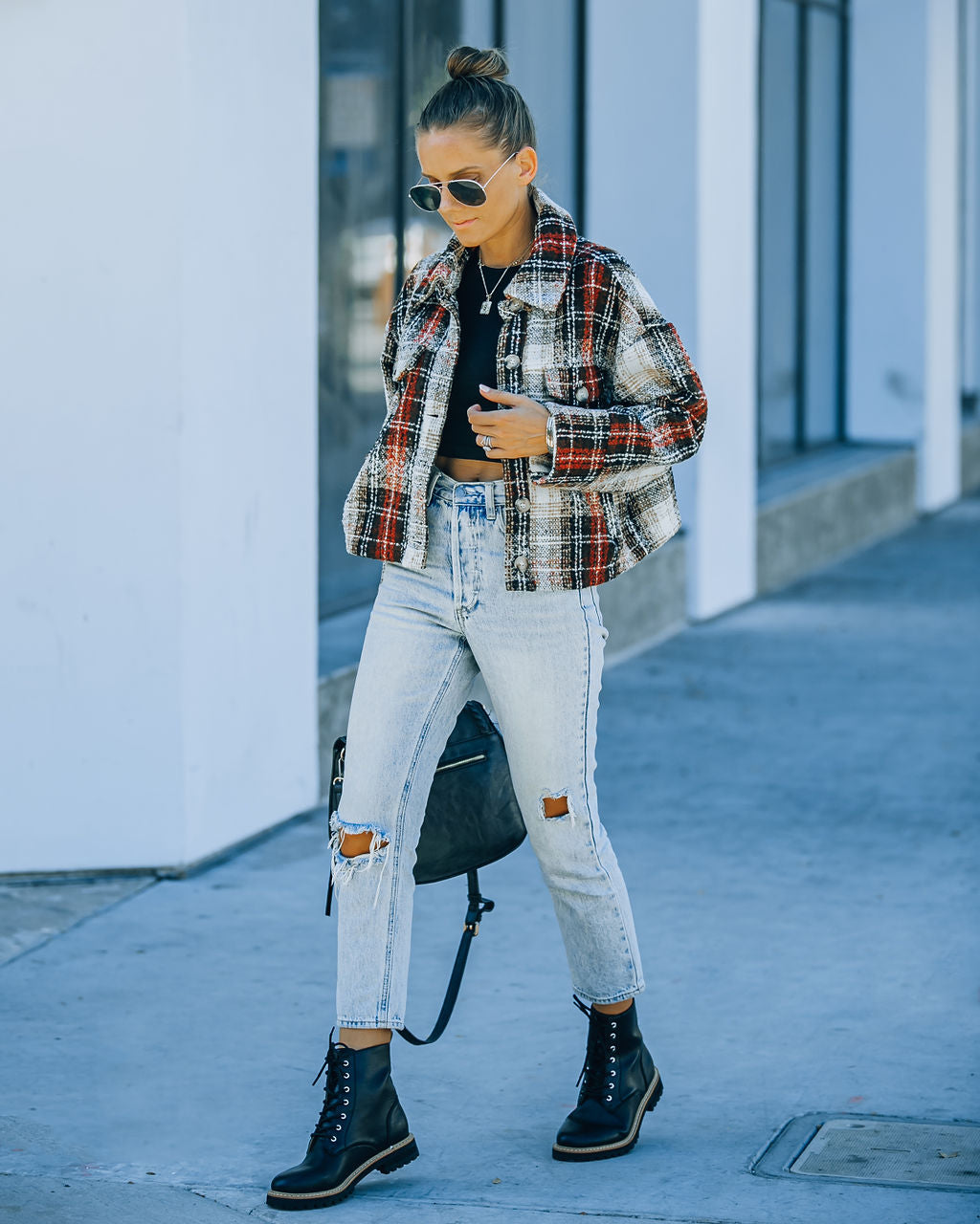 Our Chancellor Pocketed Plaid Crop Shacket is the perfect layer of warmth! Brown. rust. cream. ivory. and black plaid hues detail this cropped piece. Designed with bust and side pockets. Styled with the Initial Card Necklace. Chloe Mini Necklace. Simple Bangle Bracelet. Highland Bag. Kiki Knit Crop Top. Kason Distressed High Rise Denim. and Brycen Faux Leather Lace Up Boot.