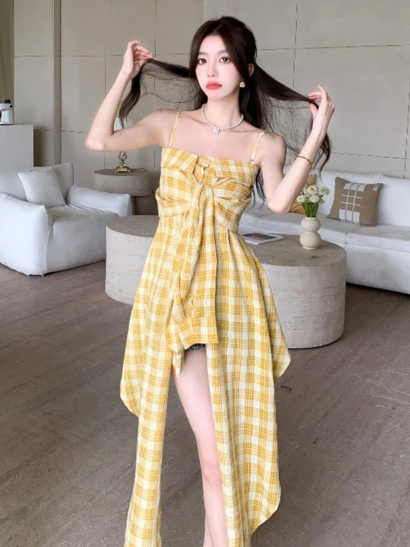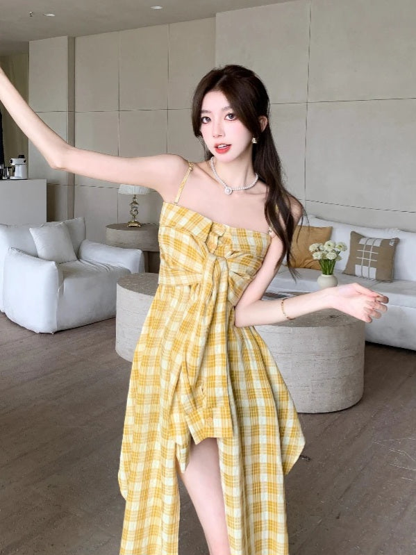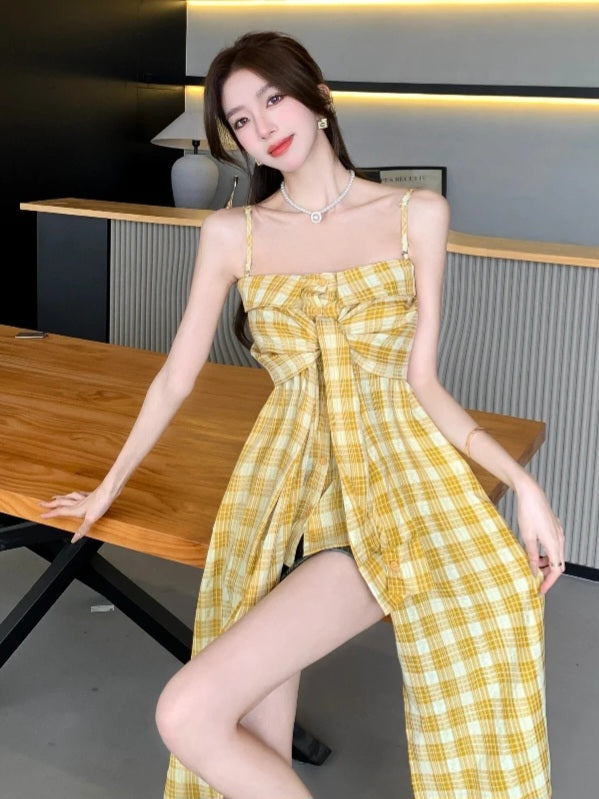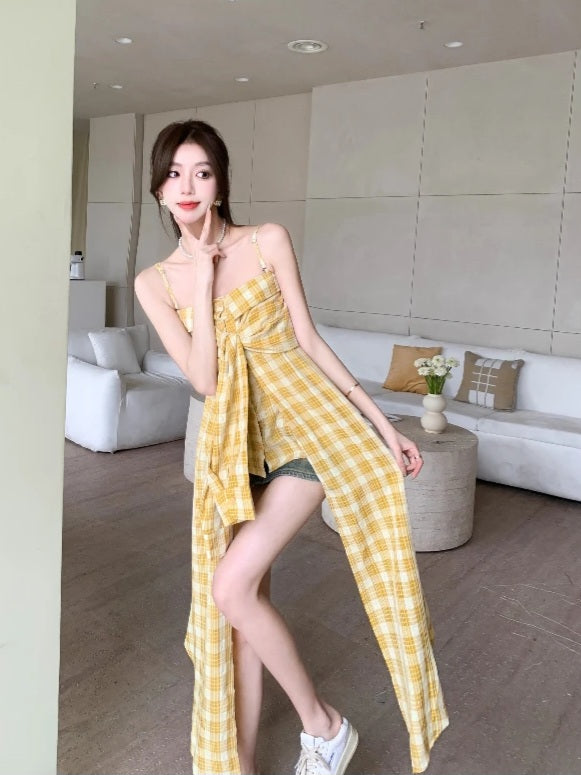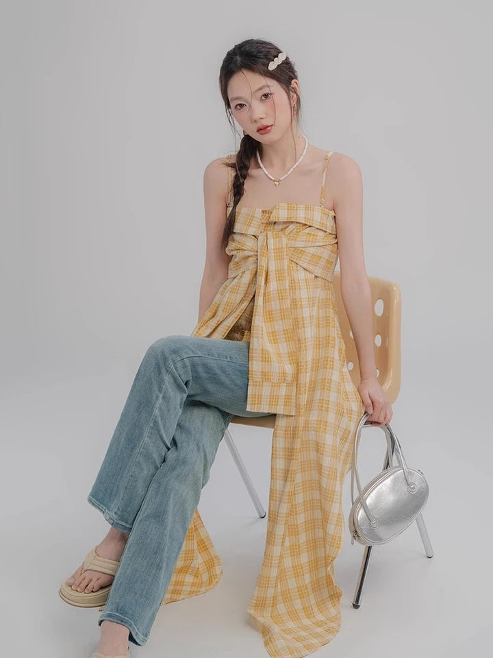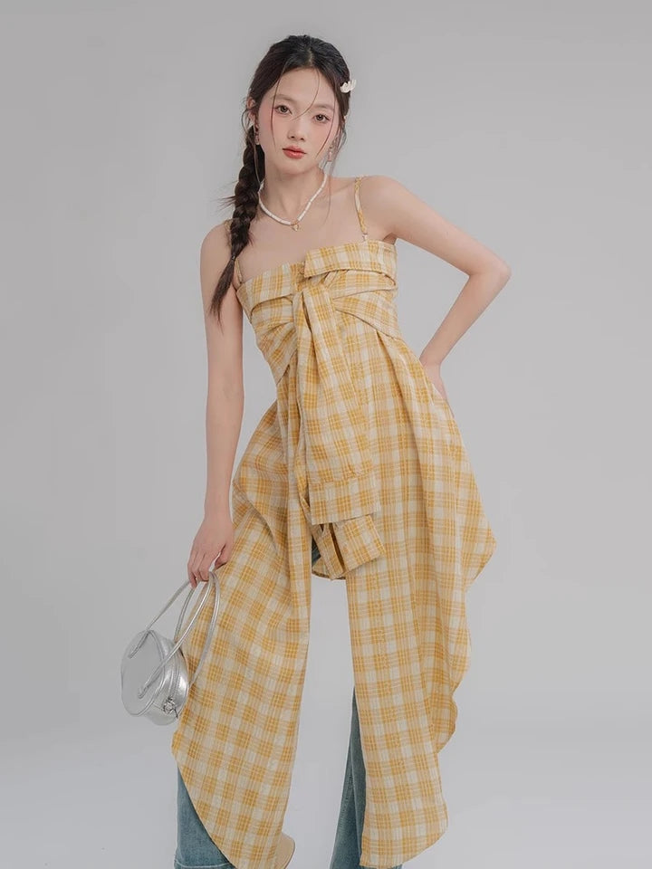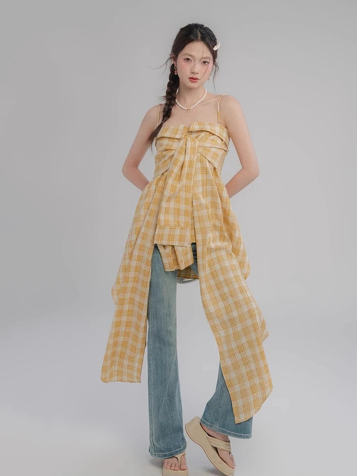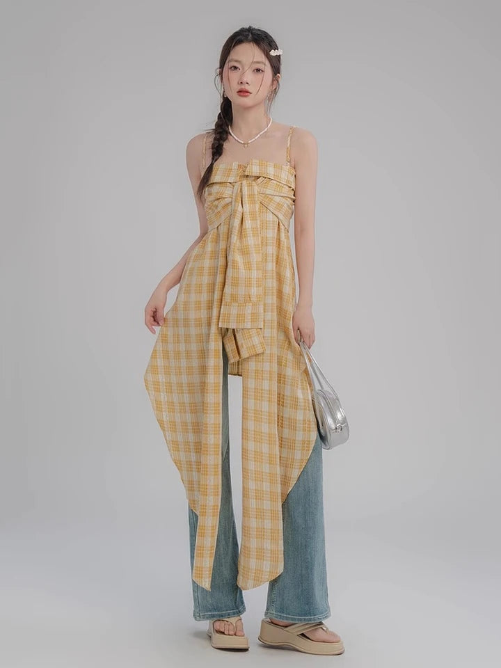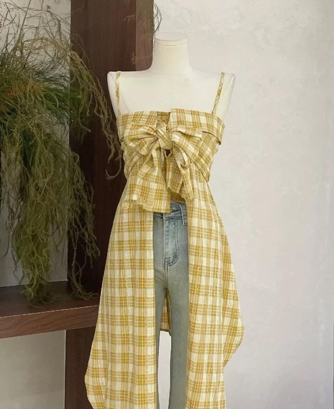This top has a prominent bow detail at the centre offering an alluring appeal. while the checkered pattern adds a rustic yet elegant touch.