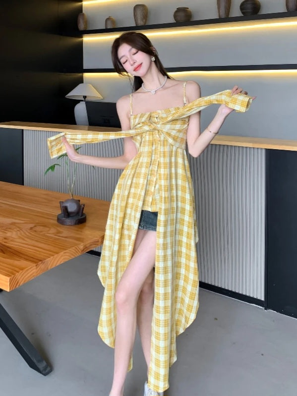 It features a unique uneven long hem design offering a versatile and stylish choice for various occasions.
