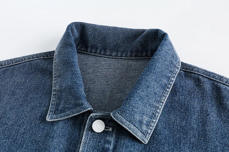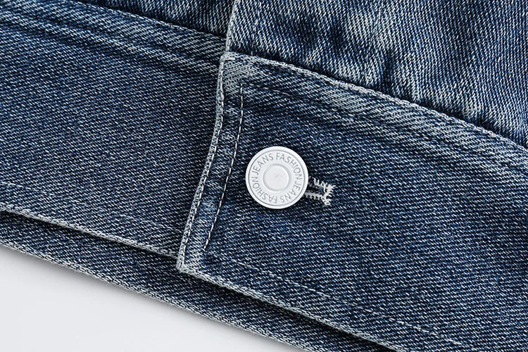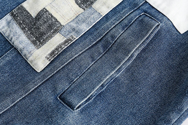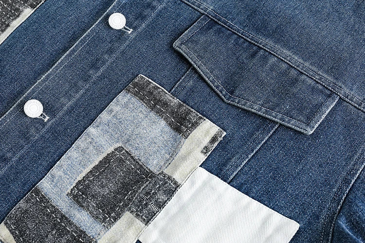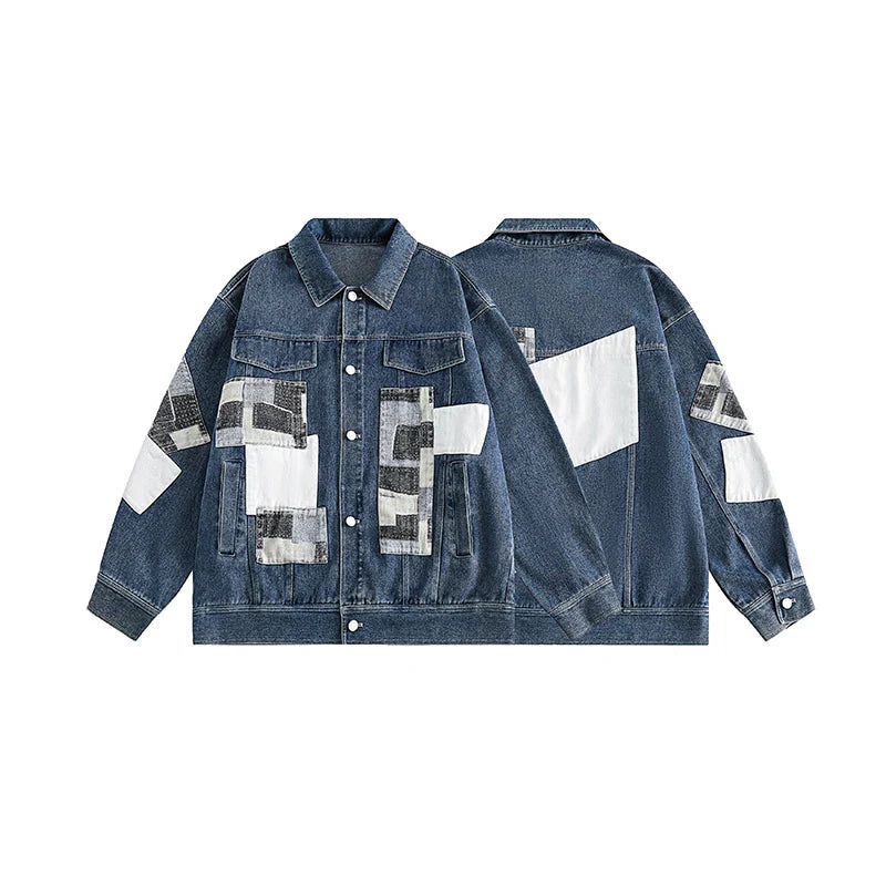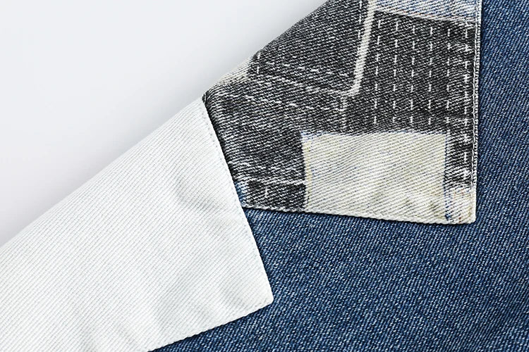 this Color Block Patches Denim Jacket is crafted from a luxurious combination of cotton and polyester. boasting a fashionable turn-down collar and a timeless single-breasted closure type of standard thickness.