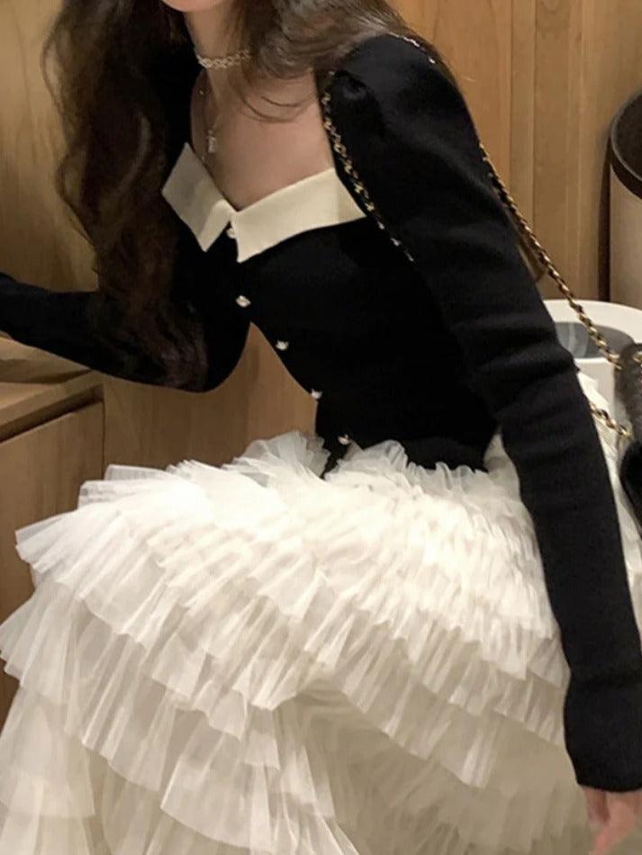 Contrast Color Splice Pearl Breasted Slit Knit Sweater
