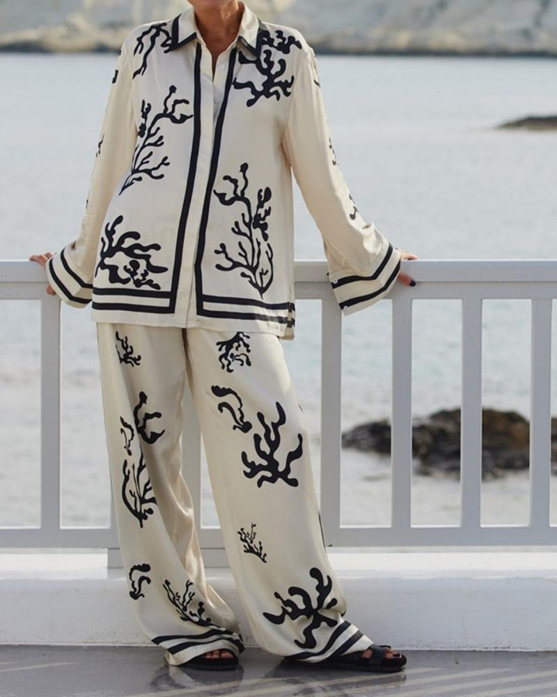 A chic and stylish outfit perfect for both casual and semi-formal settings. This set features a loose-fit top and bottom with a striking black coral pattern on a creamy white background. The top is designed with a classic collar. button-down front. and long sleeves with contrasting black stripe details on the cuffs and hem. The