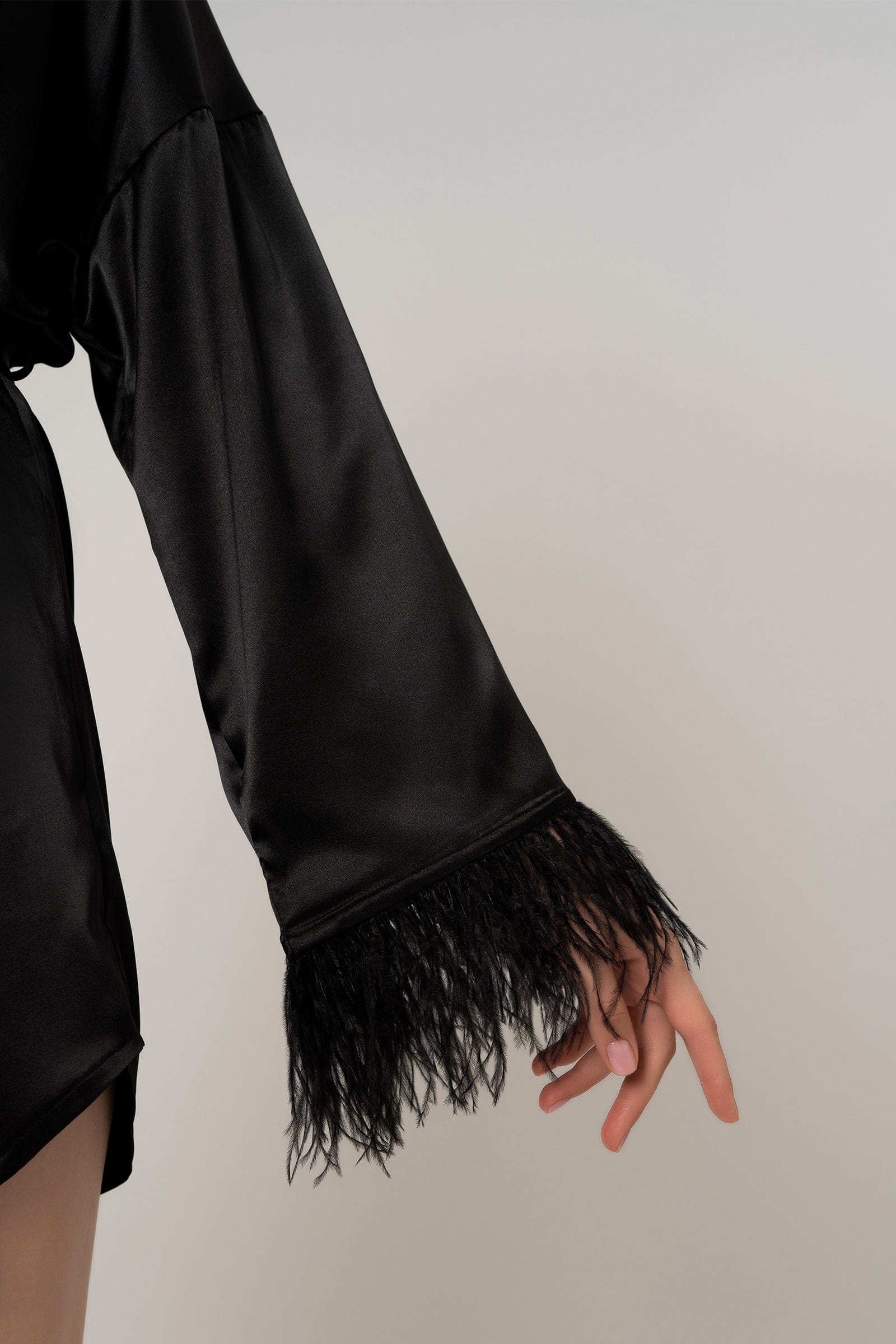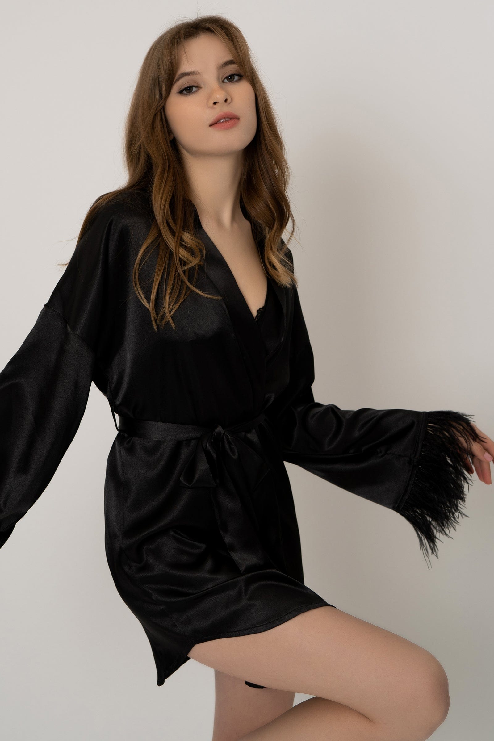 Untangle yourself from the day with our kimono robe. featuring elegant feather trim. The lightweight kimono is made from the highest-grade satin with a spectacular detail of queen quill feathers trim. adding stunning effect.