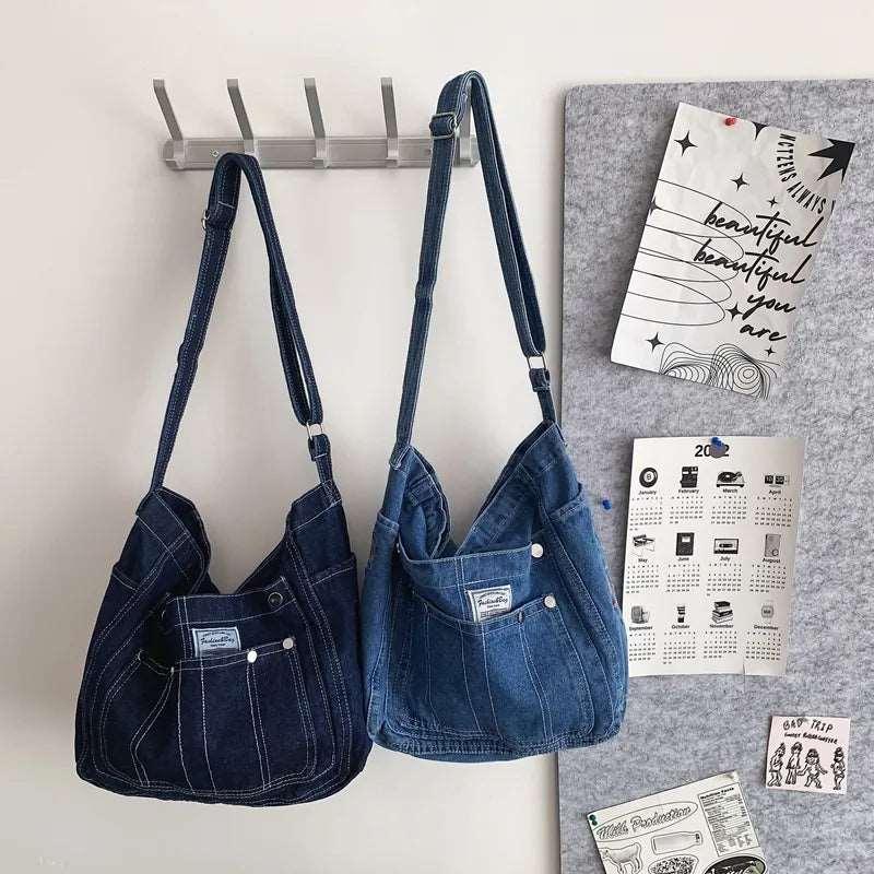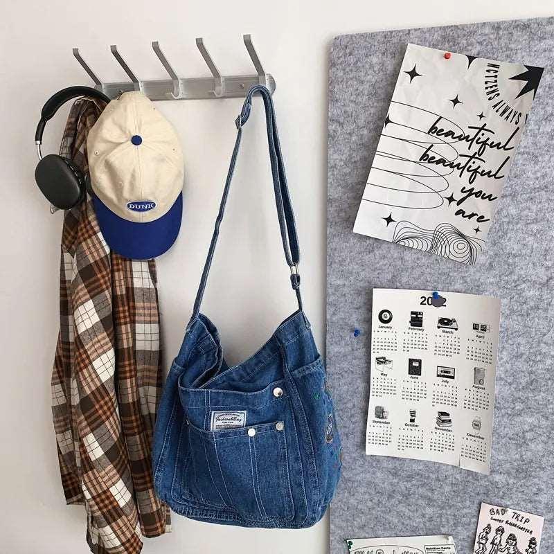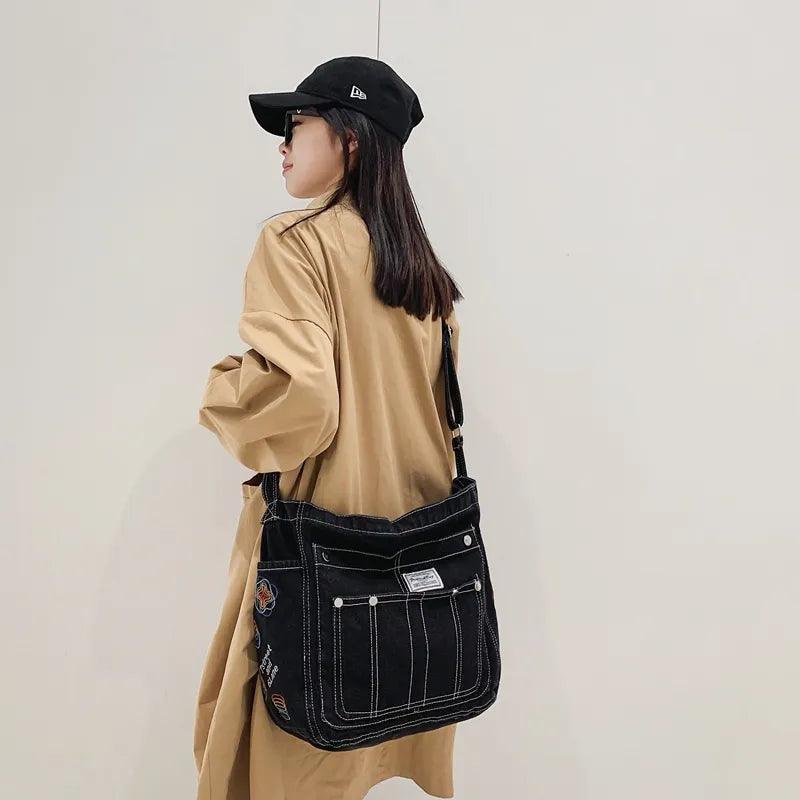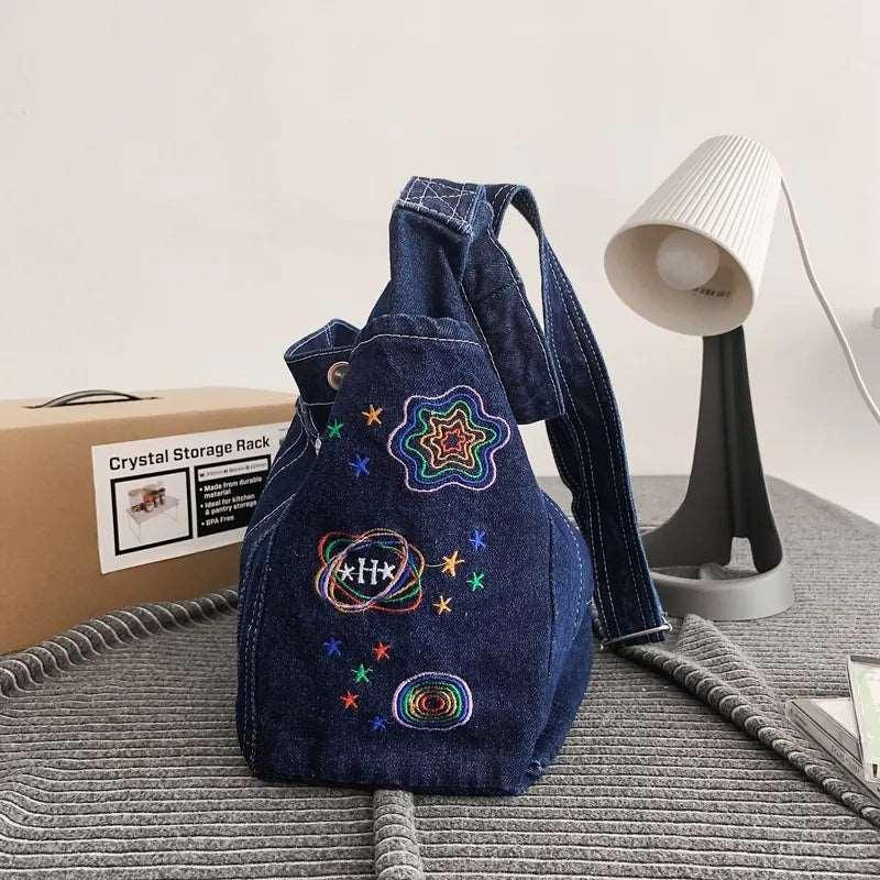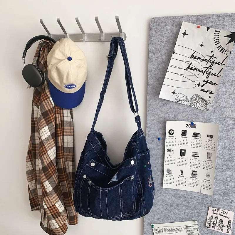 Expertly crafted with durable denim material. this versatile Denim Tote Bag features a secure zipper closure and an open exterior pocket for easy access. The simplistic solid pattern is elevated by intricate embroidered detailing. making it the perfect casual tote for any occasion.