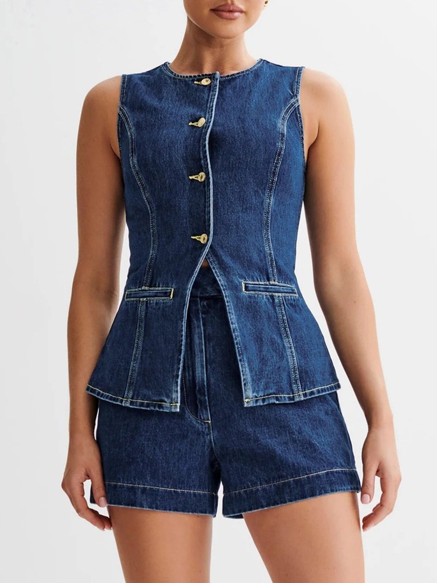 This sleeveless denim vest and shorts set. crafted from pure cotton and tailored with a slim. contoured fit. exudes an elegant demeanor. The vest boasts a minimalist yet stylish design that accentuates the shoulders. while the snug fit of the shorts highlights the body's curves. Ideal for various casual occasions. from outdoor activities to daily commutes. this ensemble effortlessly blends fashion with comfort.