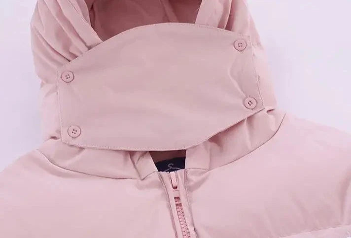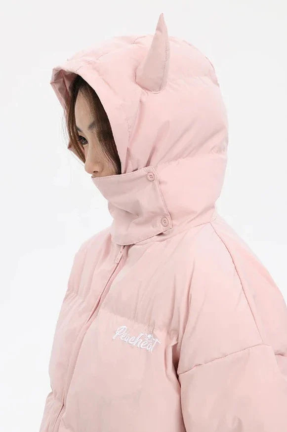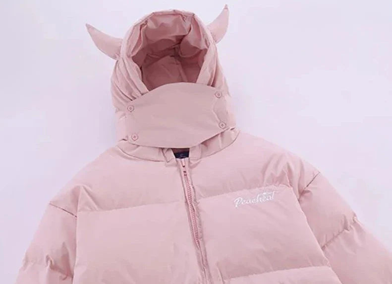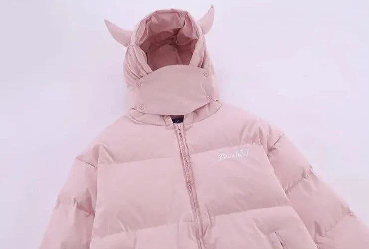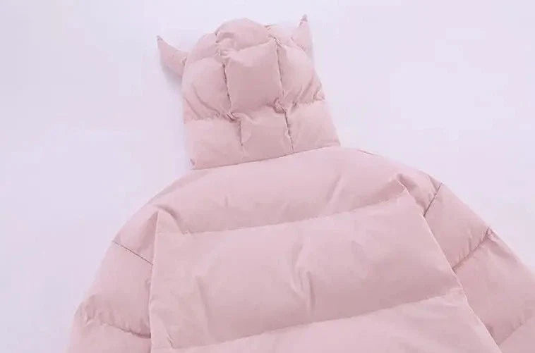 Introducing Vonvex's Devil's Horn Hooded Puffer Jacket. Made from polyester and cotton with spray-bonded wadding filling. it features a thick. loose fit. The broadcloth fabric. embroidery decoration. and solid pattern enhance its style. while the zipper closure and devil's horn hood add a unique touch.