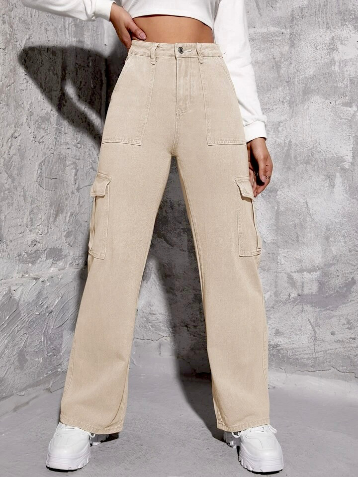 The high-waisted denim pants feature a distinctive design with cargo pockets. outer pocket lines. divider lines and a flap on the pocket for added safety.