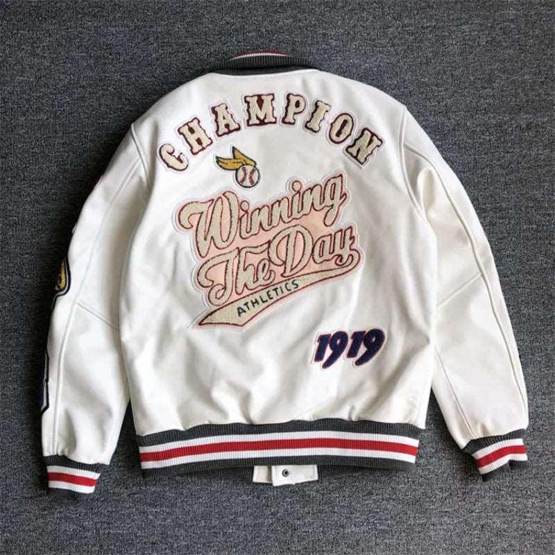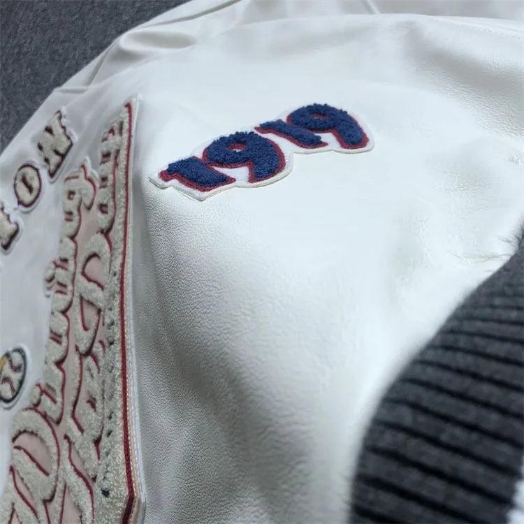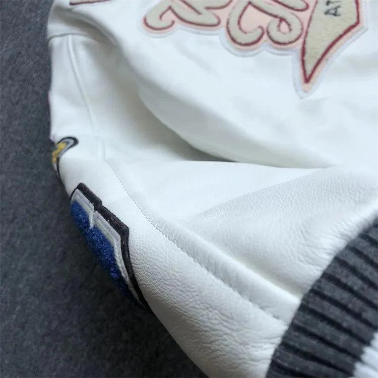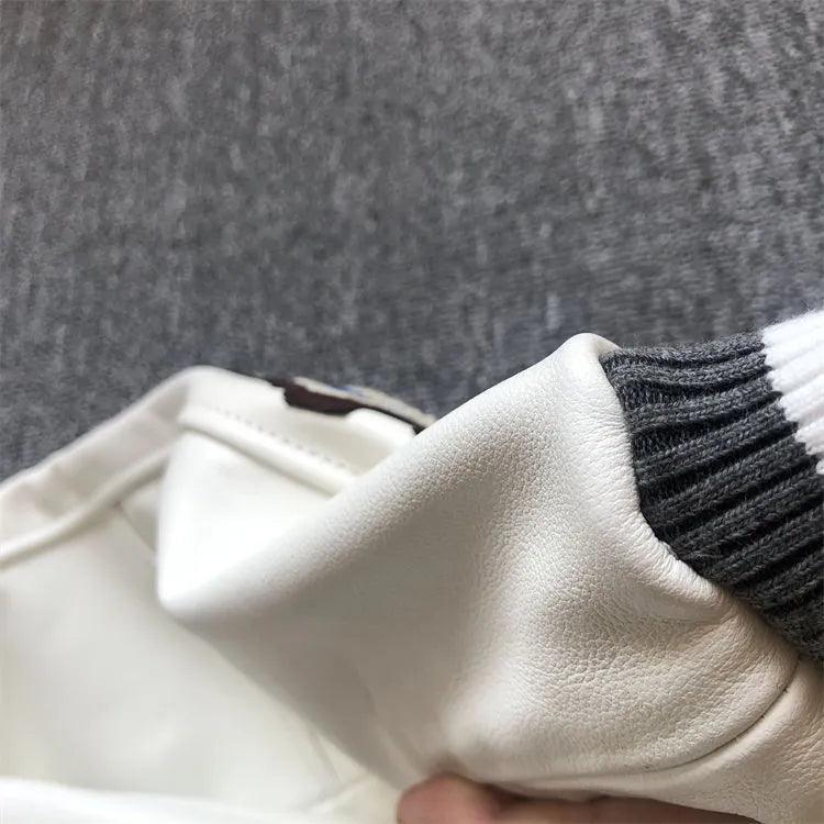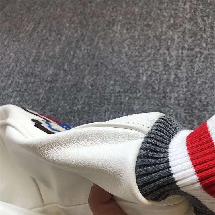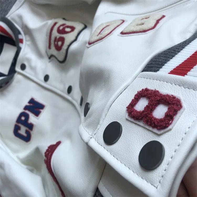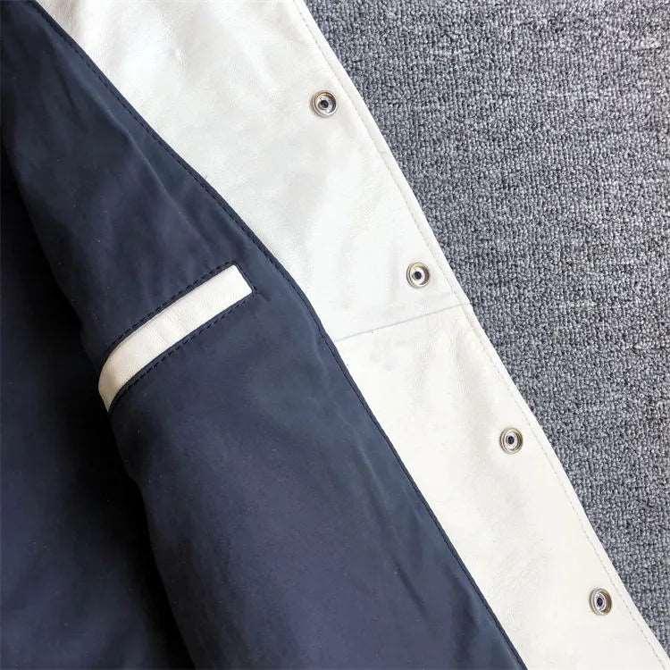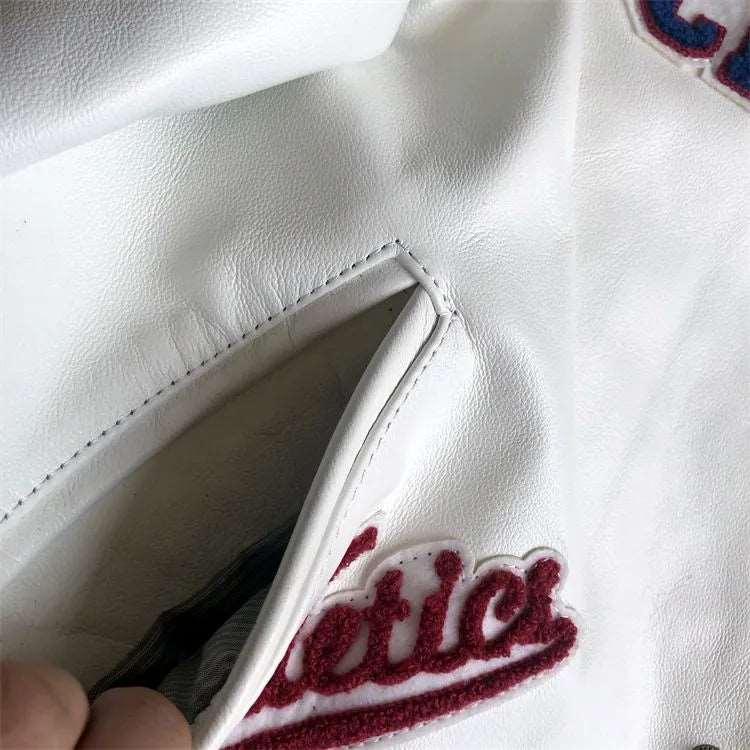 Constructed with a blend of cotton and polyester. this Preppy Style leather jacket features a regular length and sleeve for a well-tailored fit.