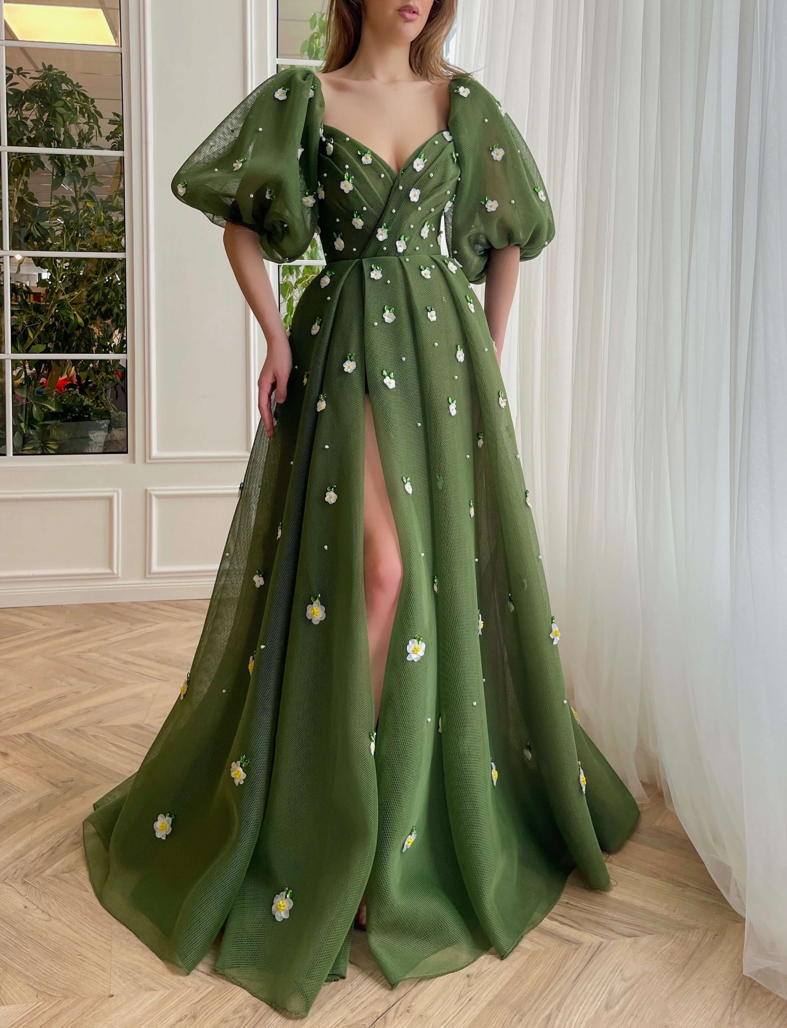 This dress is adorned with embroidered daisy flowers accentuated by pearls. The draped bodice and cinched waist enhance the figure.