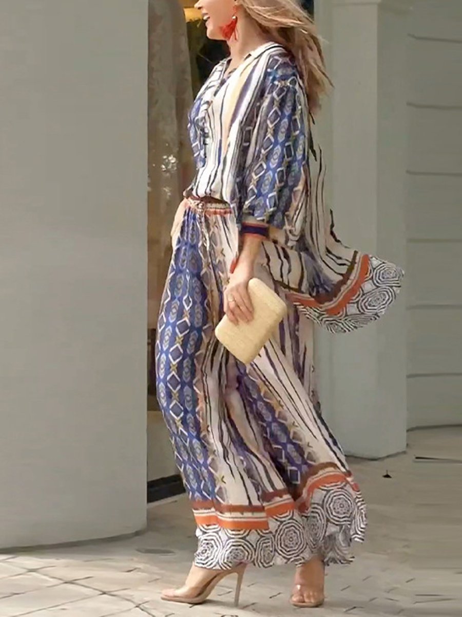 This Bohemian-style blouse and wide-leg pants set features a flowing. drapey silhouette perfect for summer. The breathable and cool fabric ensures comfort on warm days. while the soft material feels gentle against the skin. The striking combination of blue and orange adds a vibrant. stylish touch to this elegant ensemble.