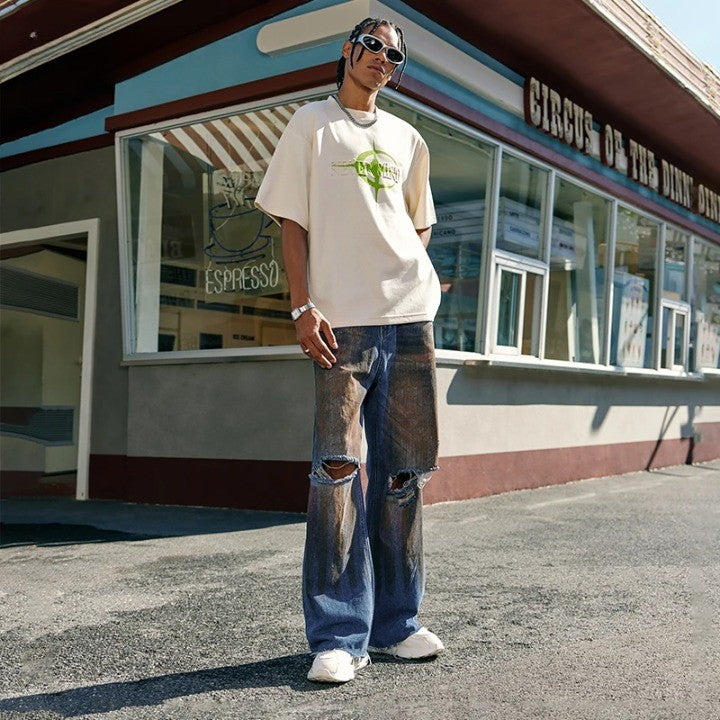 Introducing Vonvex Streetwear's Faded Effect Wide Leg Ripped Jeans. crafted from a blend of 86.5% cotton. 6% poly cool. and 7.5% viscose for comfortable yet durable wear. Utilizing the TAT weaving technique and featuring a midweight denim construction. these jeans boast a stylish faded effect and subtle rip details. With a regular fit. mid-rise waist. and zipper fly closure. they offer both comfort and contemporary streetwear appeal. Ideal for all seasons. elevate your wardrobe with Vonvex's effortlessly cool Faded Effect Wide Leg Ripped Jeans. perfect for versatile and stylish everyday wear.