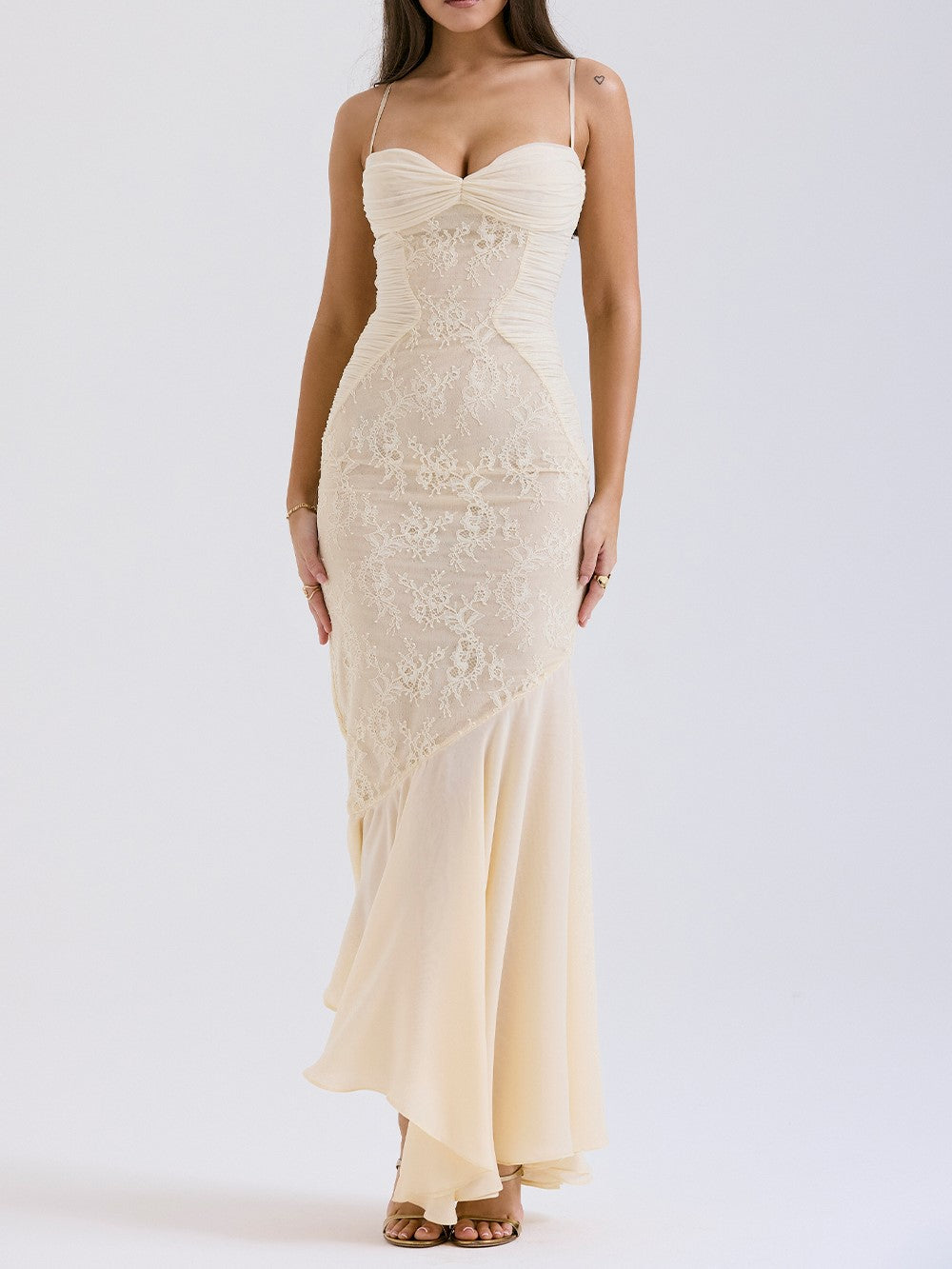 This Felicia dress is cut from delicate lace and exquisite chiffon. with a softly gathered bust and thin adjustable straps.