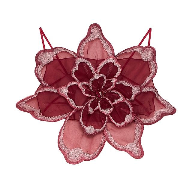 This top features embroidered organza petals and tiny elastic straps with a metal clasp at the back
