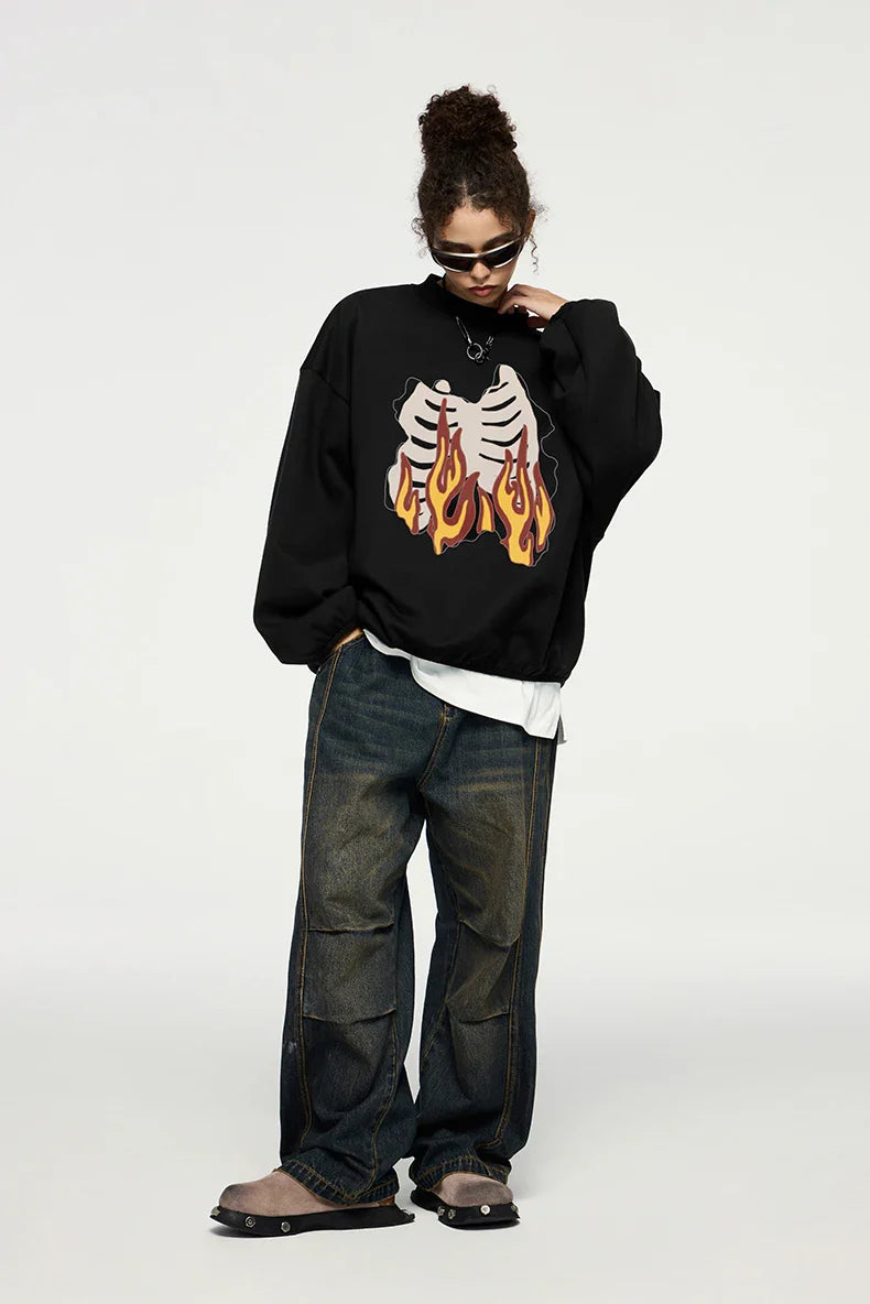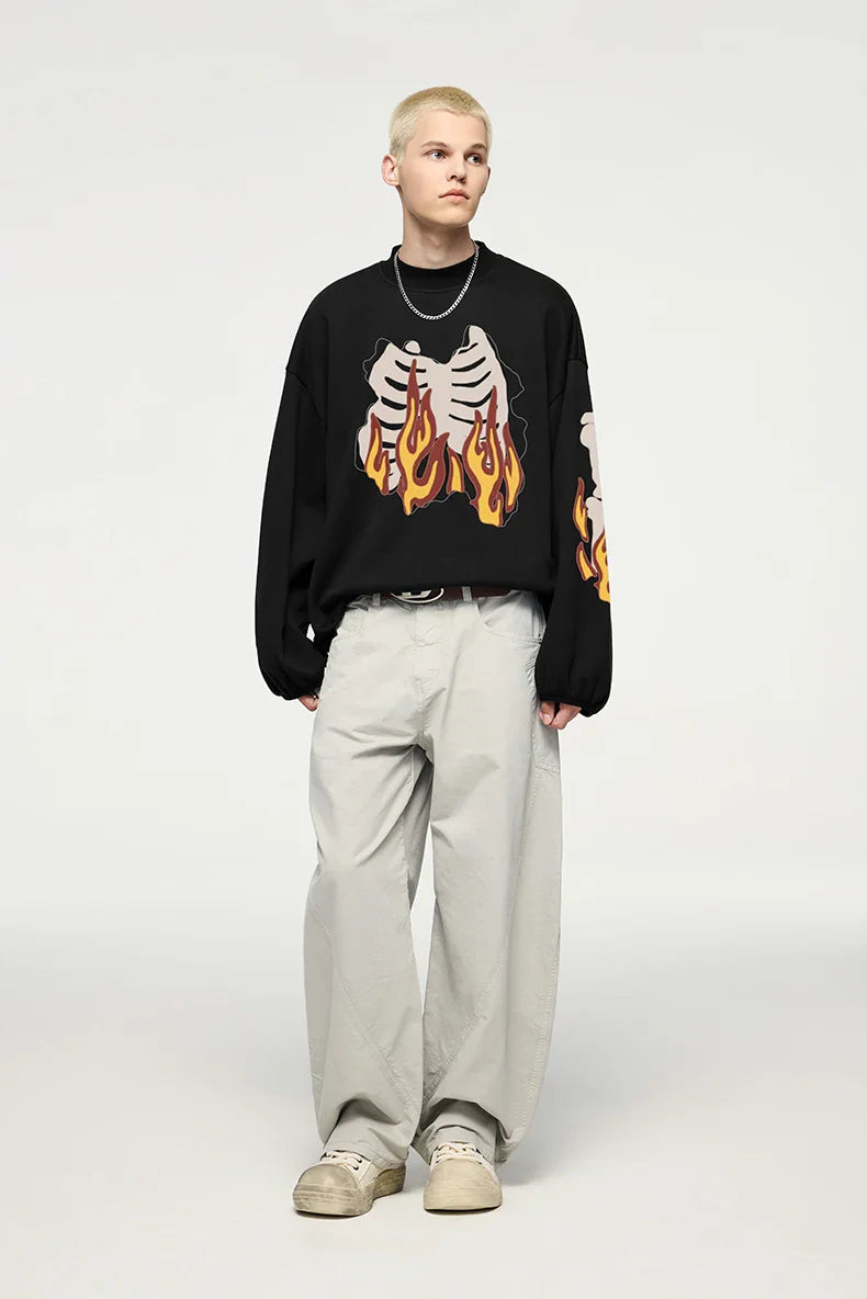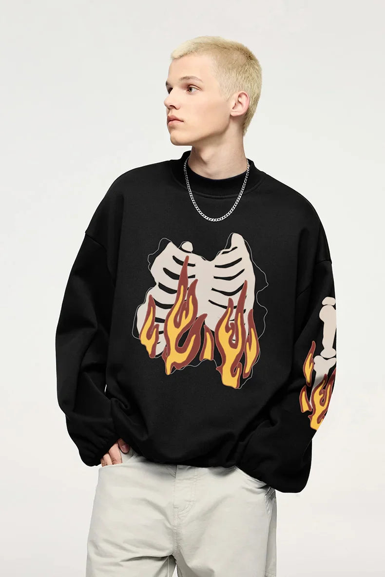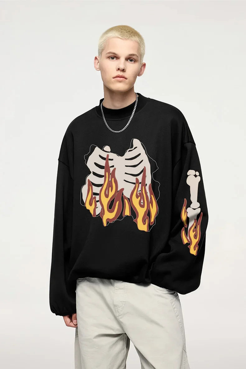 "Flaming Skeleton Sweatshirt: Bold and edgy. featuring a fiery skeleton graphic for standout streetwear vibes."