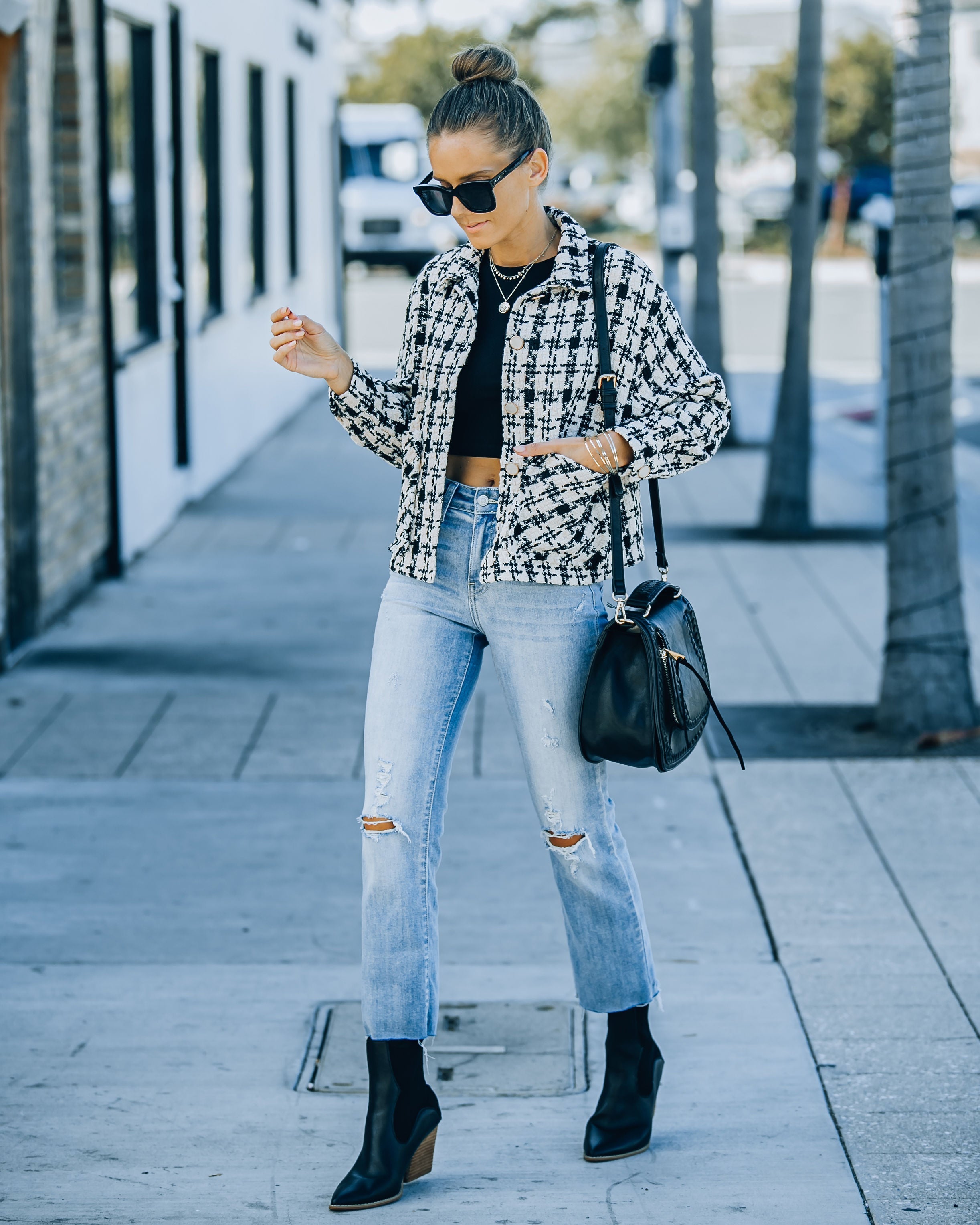 Tweed is currently trending! Our Foxhurst Pocketed Tweed Jacket features preppy black and ivory squares. Designed with front pockets and a collar. Secured with front button closures. Styled with the Carson Black Frame Dark Smoke Polarized Sunglasses. Chloe Mini Necklace. Compass Coin Necklace. Simple Bangle Bracelet. Highland Bag. Kiki Knit Crop Top. Mcguire High Rise Distressed Denim. and Jocelyn Heeled Bootie.