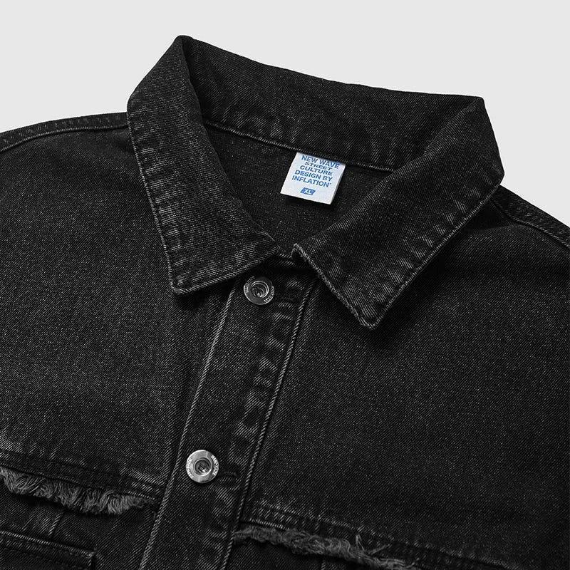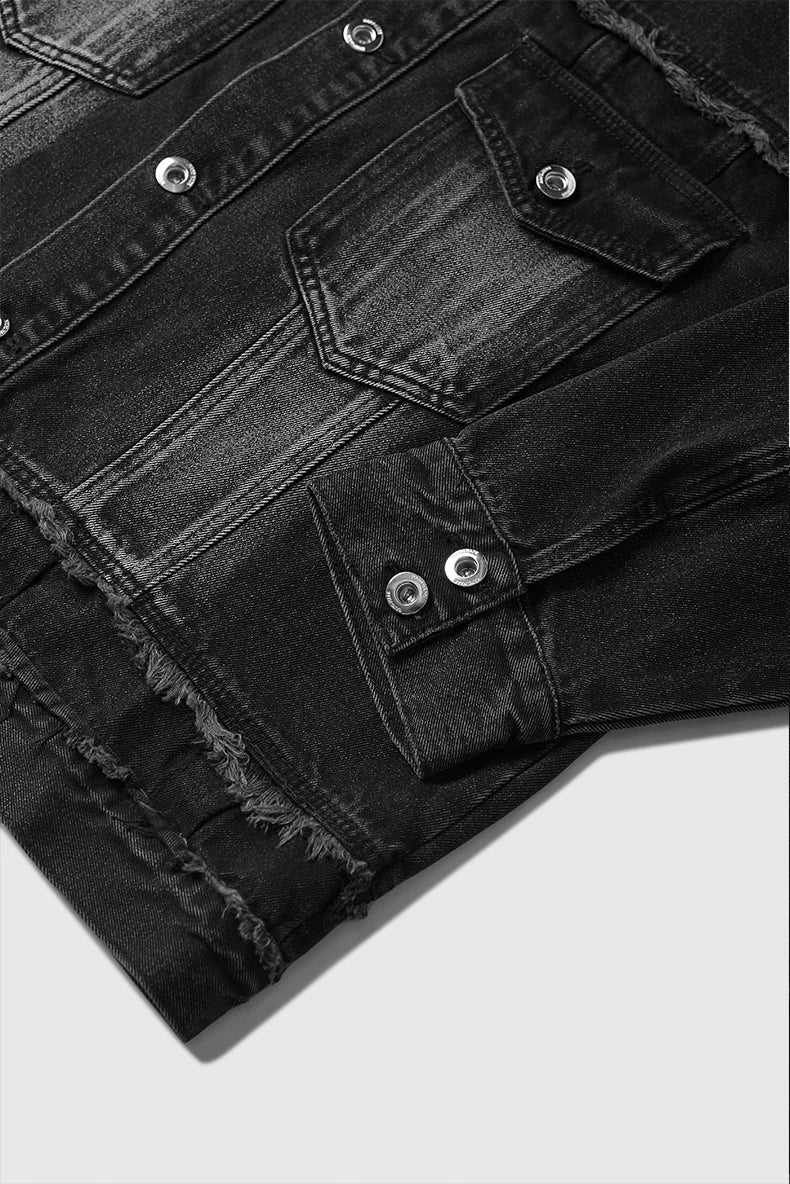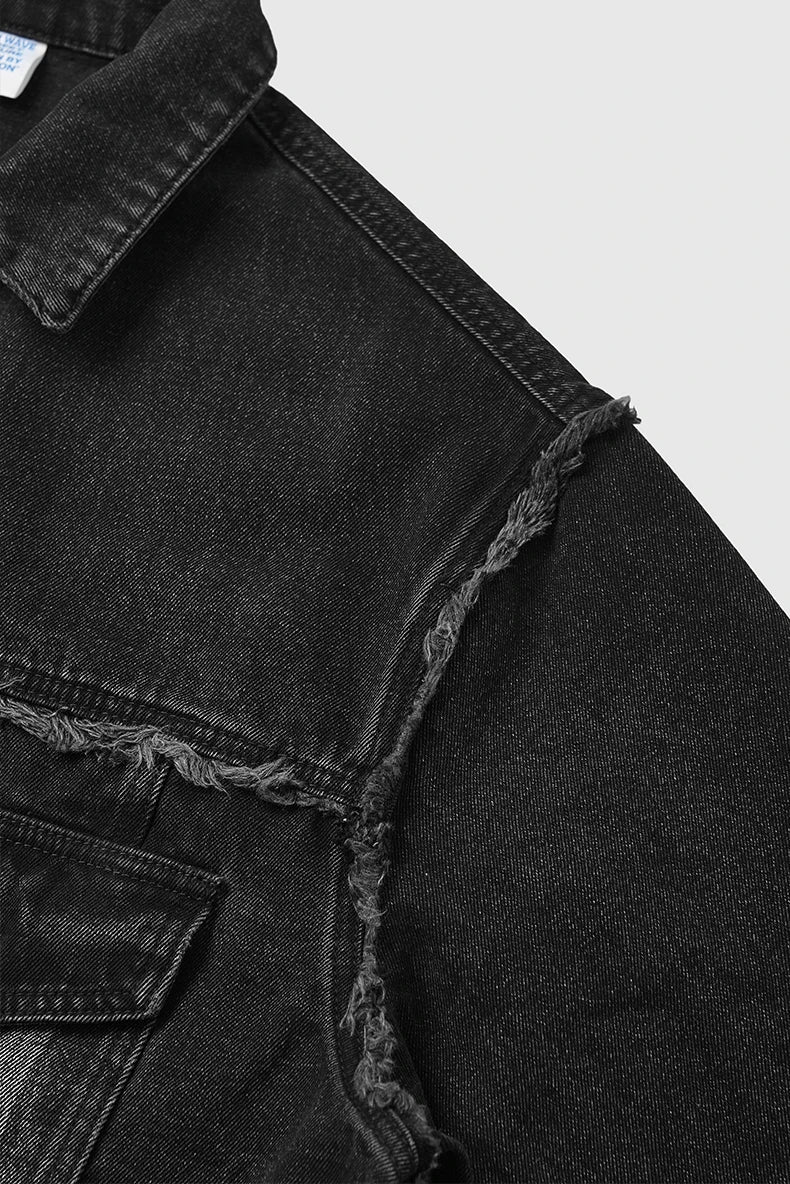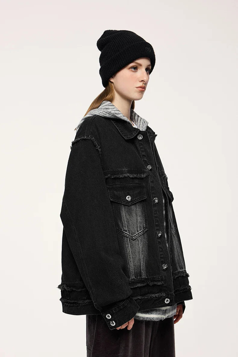 "Frayed Bleached Denim Jacket: Edgy and chic. featuring a cropped fit with frayed edges and a bleached finish."