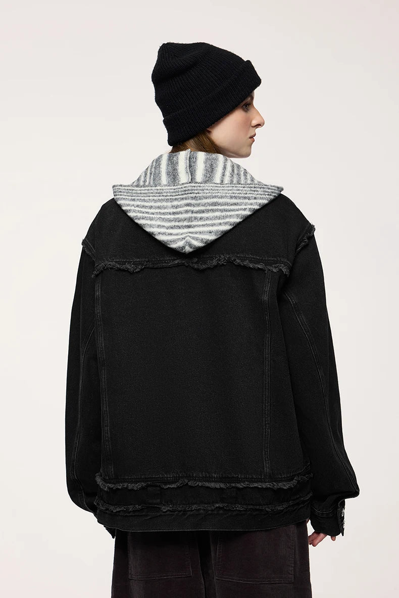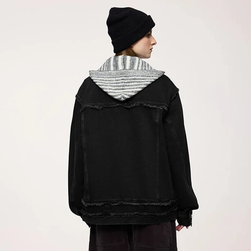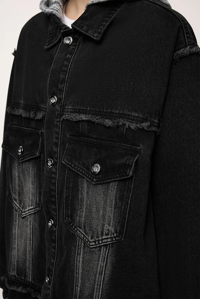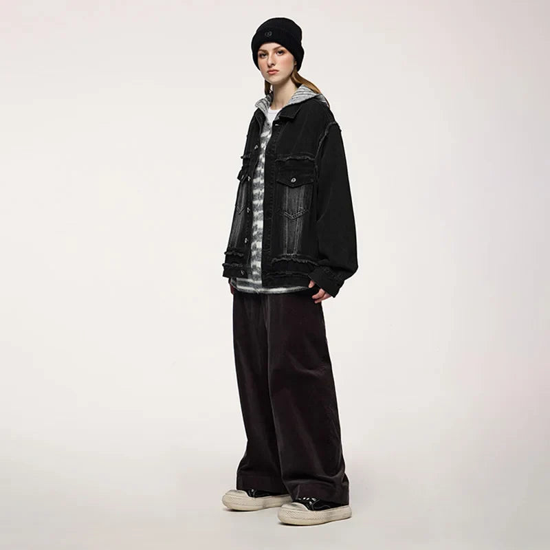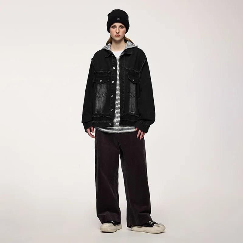 "Frayed Bleached Denim Jacket: Edgy and chic. featuring a cropped fit with frayed edges and a bleached finish."