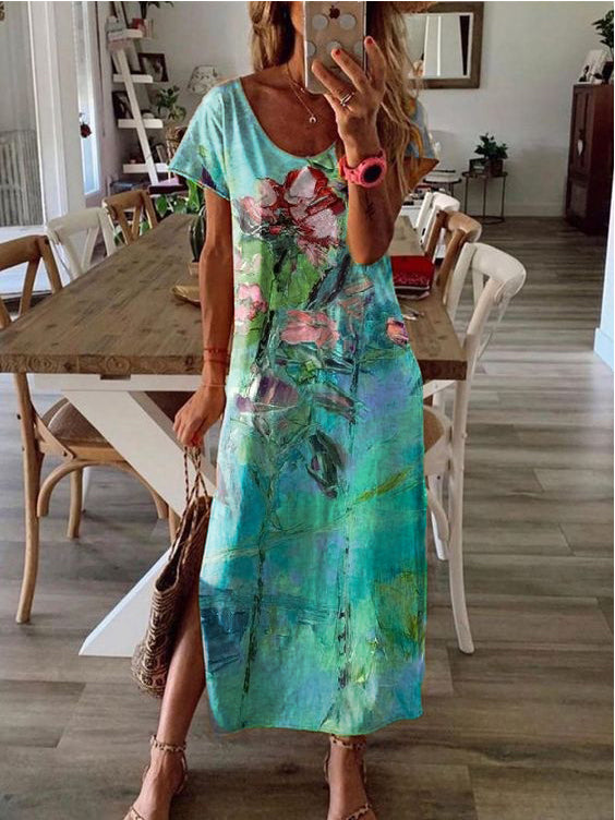 Casual Art Oil Painting Floral Round Neck Short Sleeve Hem Slit Long Dress