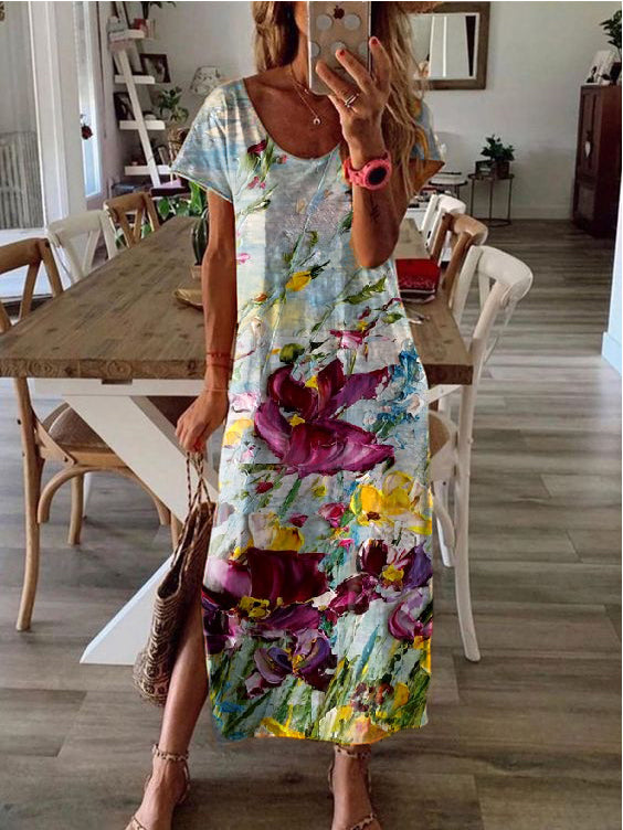 Casual Art Oil Painting Floral Round Neck Short Sleeve Hem Slit Long Dress