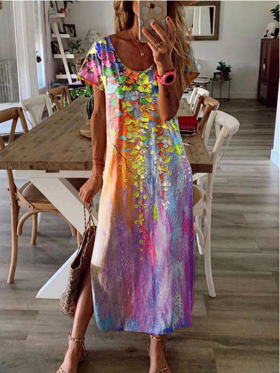 Casual Art Oil Painting Floral Round Neck Short Sleeve Hem Slit Long Dress