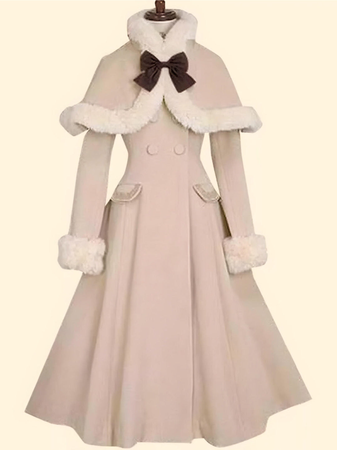 White fur trim adorns the cuffs. and capelet. with a large bow at the neckline.