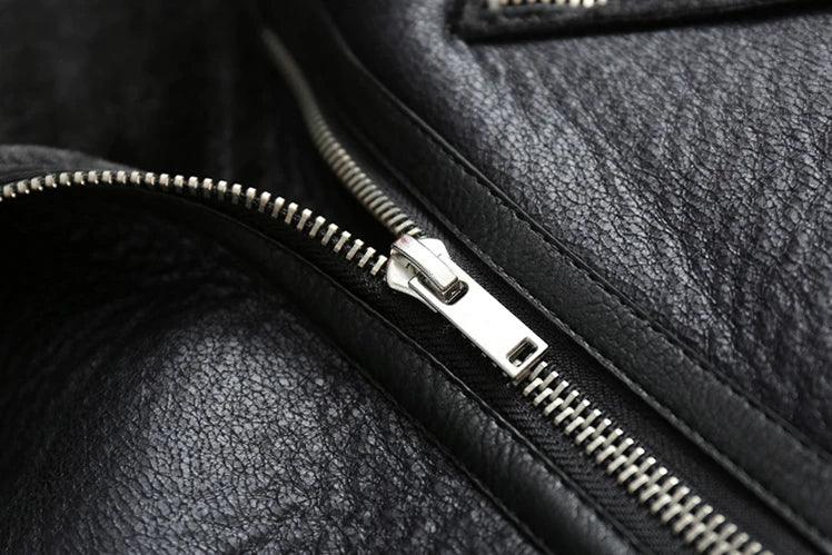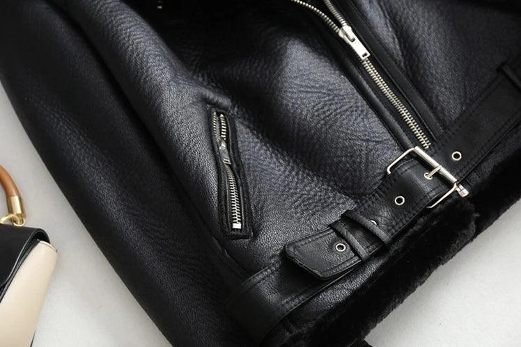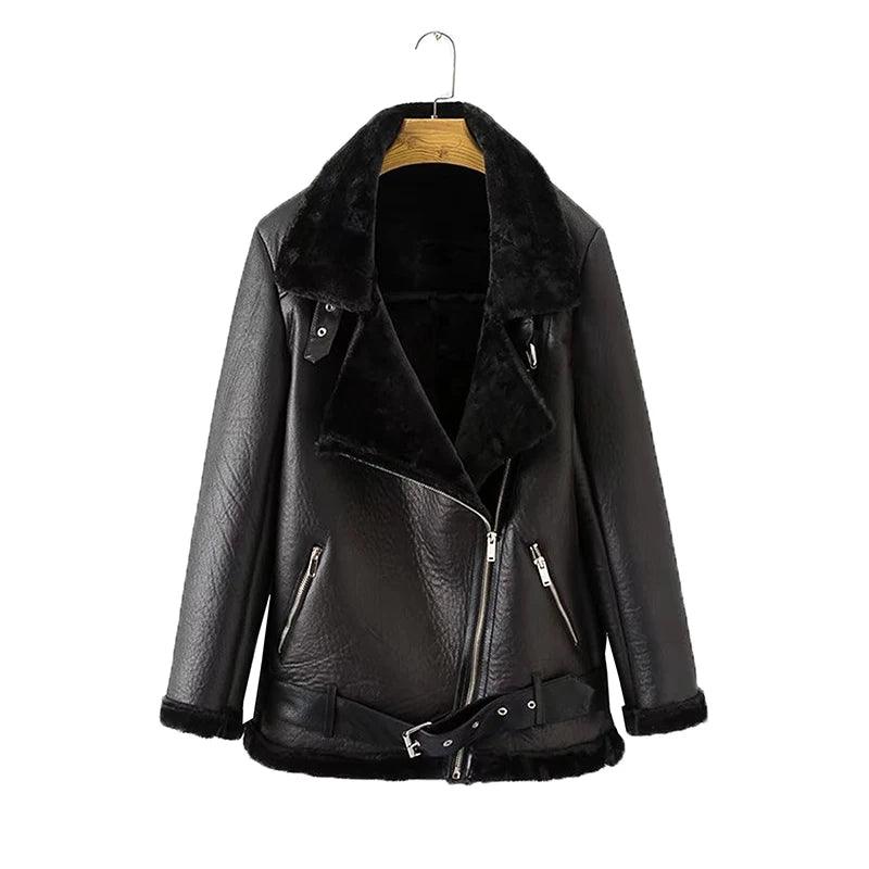 Elevate your street style with this Fur Leather Jacket. Turn-down collar. faux leather. and zipper closure for a vintage y2k look.