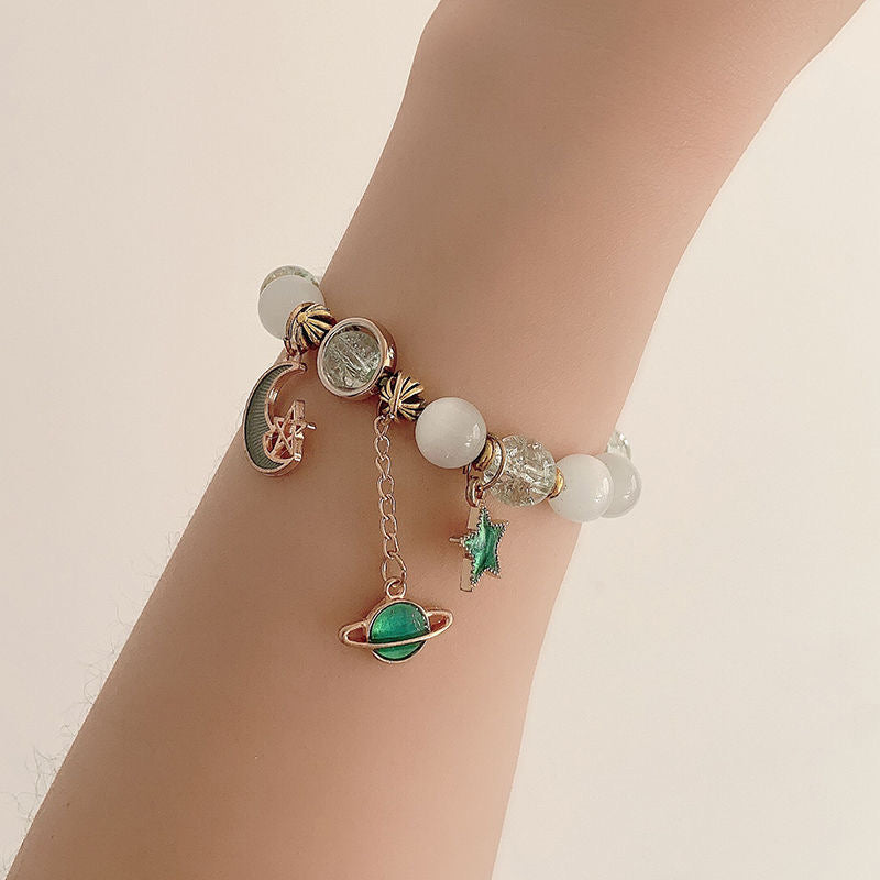 Adorned with Celestine charms of a half moon. Saturn. and a star. the bracelet represents the enchanting allure of the night sky