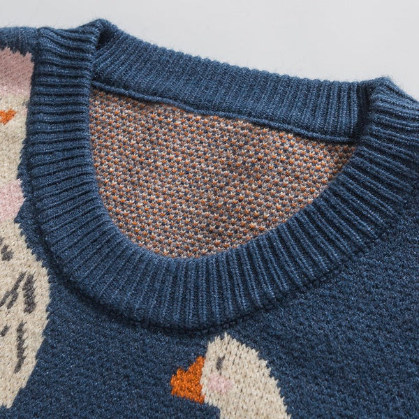 It's a crew neck lazy sweater with elastic cuff and hem to lock temperature to keep warm in cold fall and winter. flocked goose patterned sweater best for outfits and home wear.