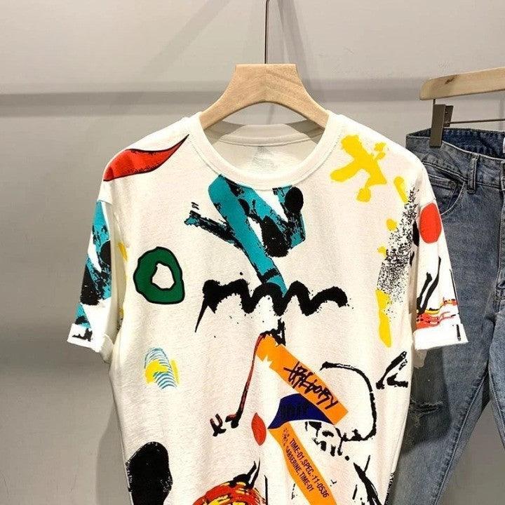 "Elevate your style with the Graffiti Pattern Knitted T-Shirt. blending vintage charm with modern flair. Crafted from cotton knit. featuring an O-Neck collar and graffiti print pattern. Perfect for adding an edgy vibe to your wardrobe."