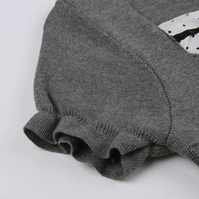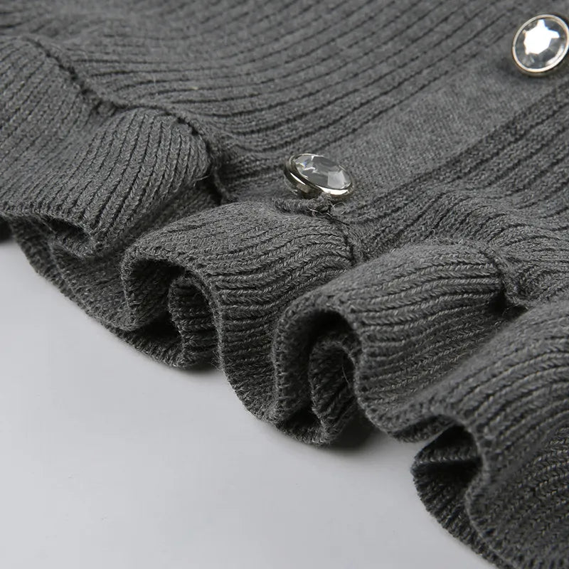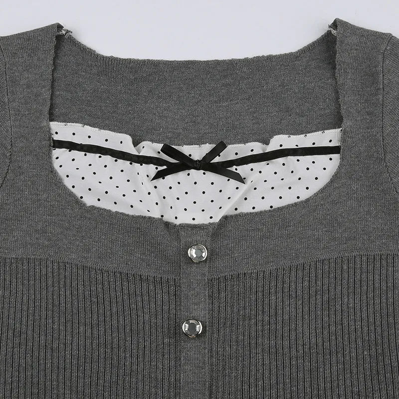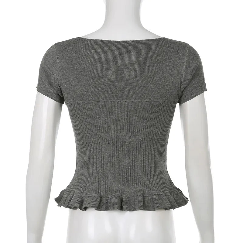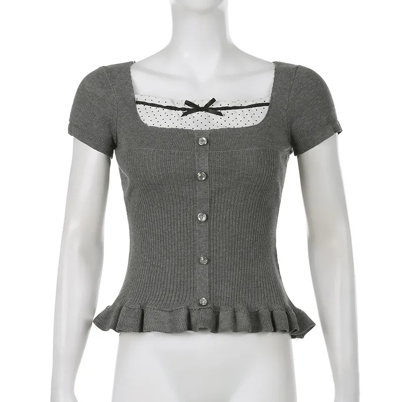 This top elevates the classic milkmaid style with short cap sleeves and rhinestone buttons on an elegant dark gray knit top.