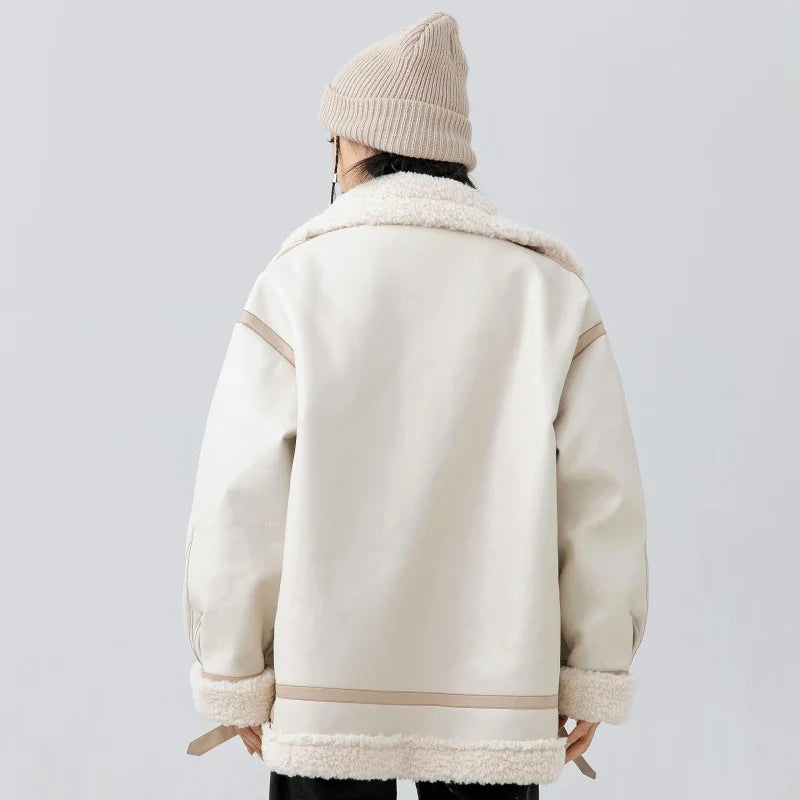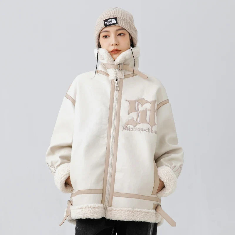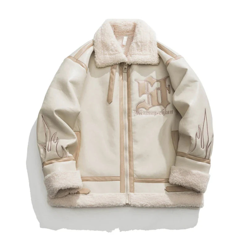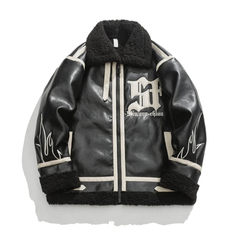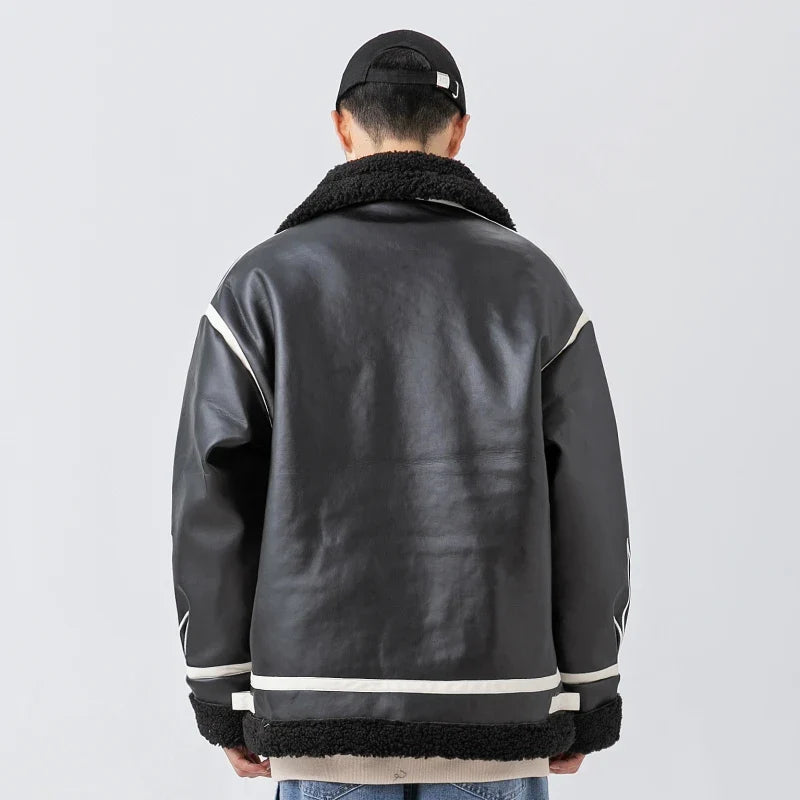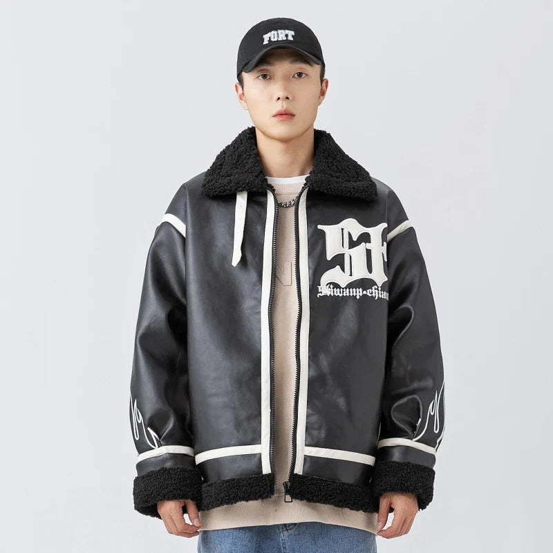 Crafted with lavish materials like cotton and polyester. the Heating Fur Leather Jacket boasts a turn-down collar and a thick. English elements pattern.